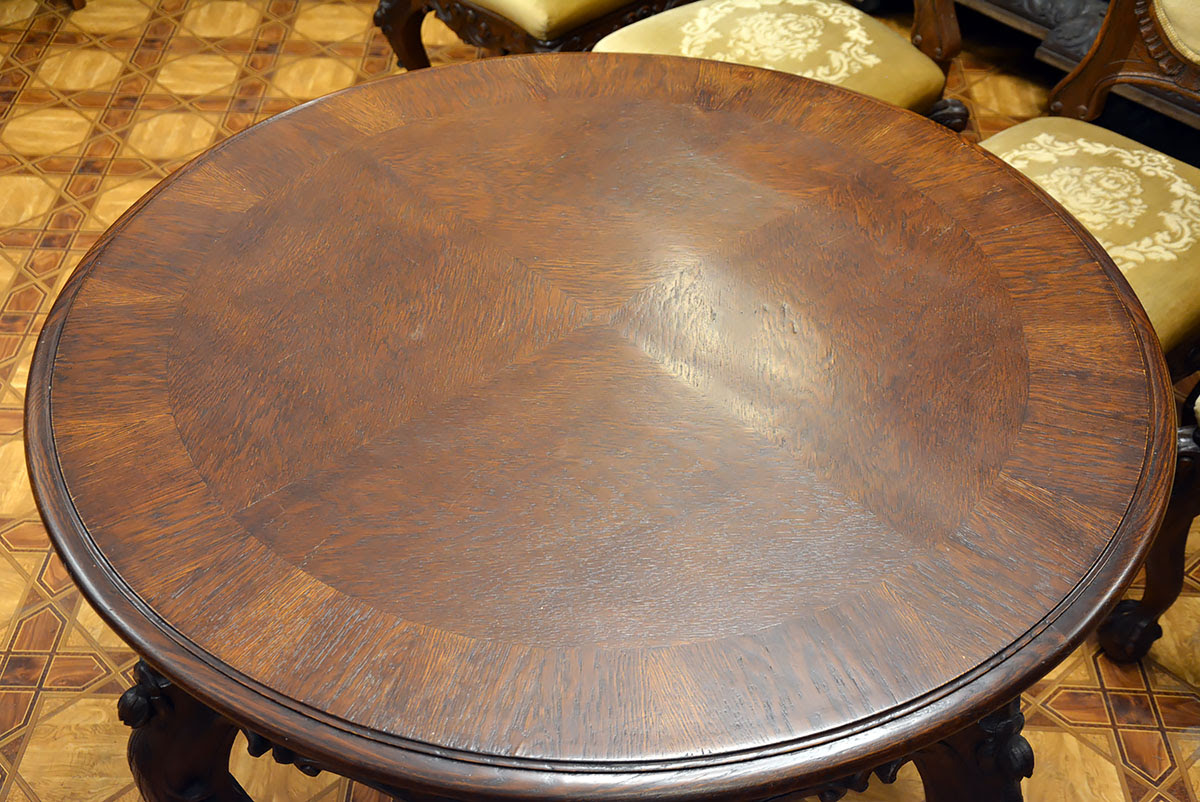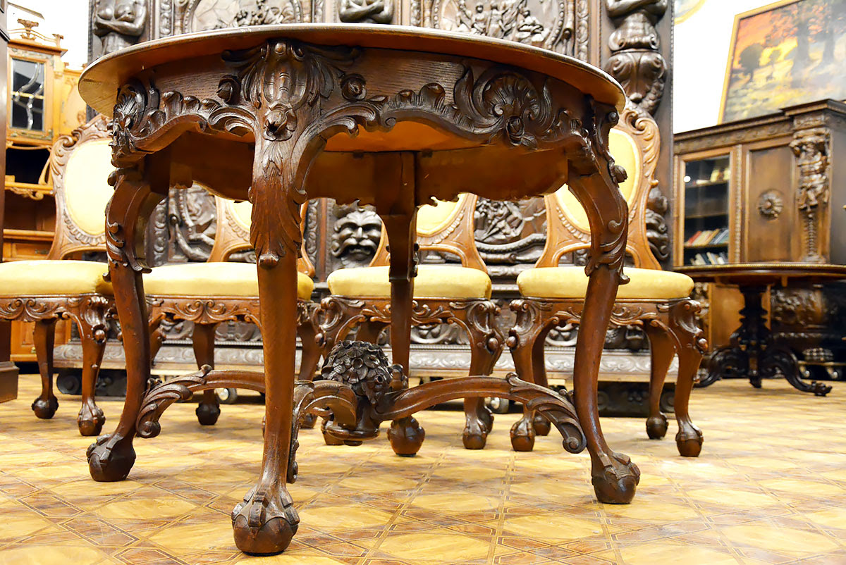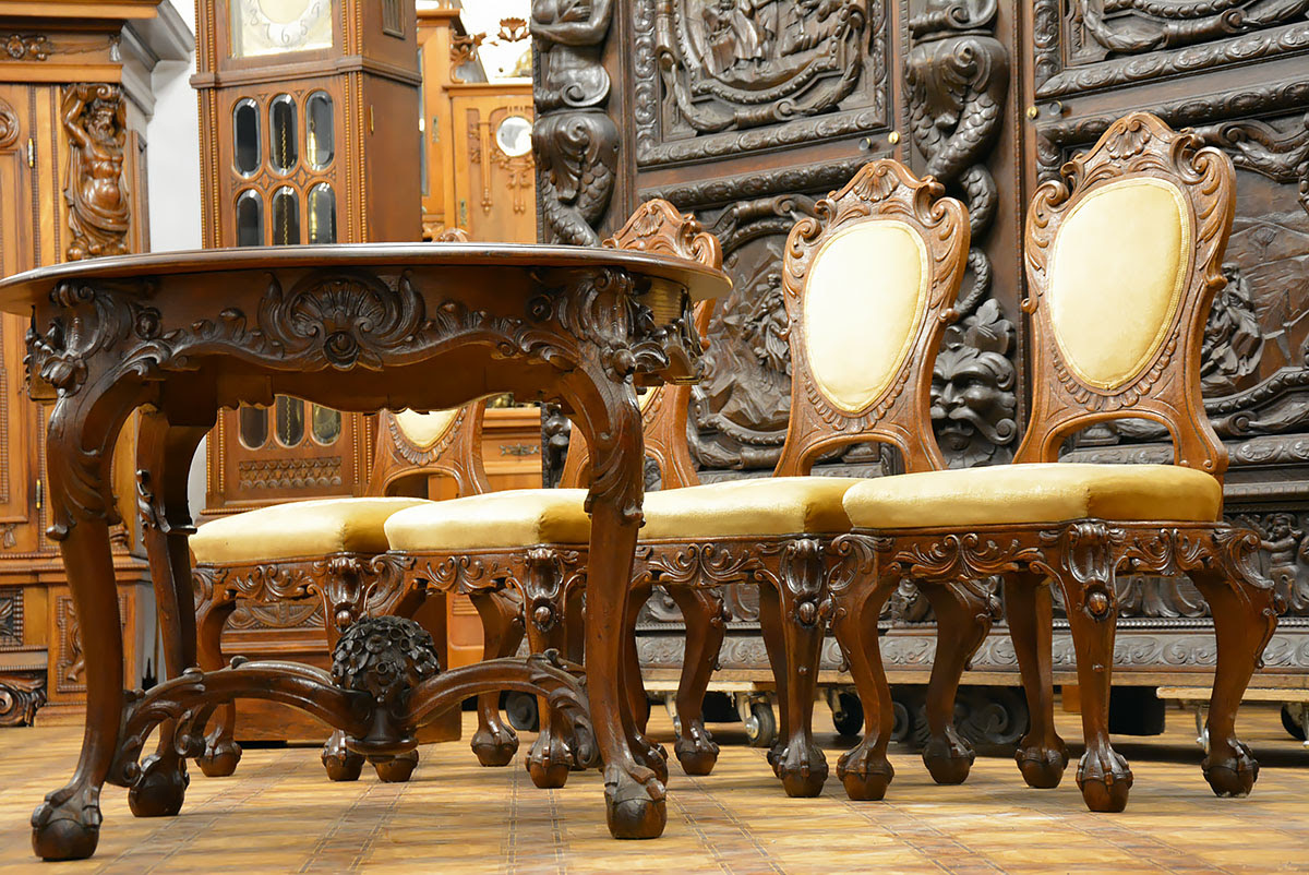 Stół i krzesła zdobi przepiękna, rzadko spotykana snycerka, dzięki której komplet prezentuje się niezwykle efektownie i stanowi ozdobę każdego wnętrza.