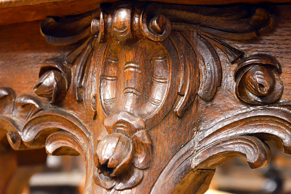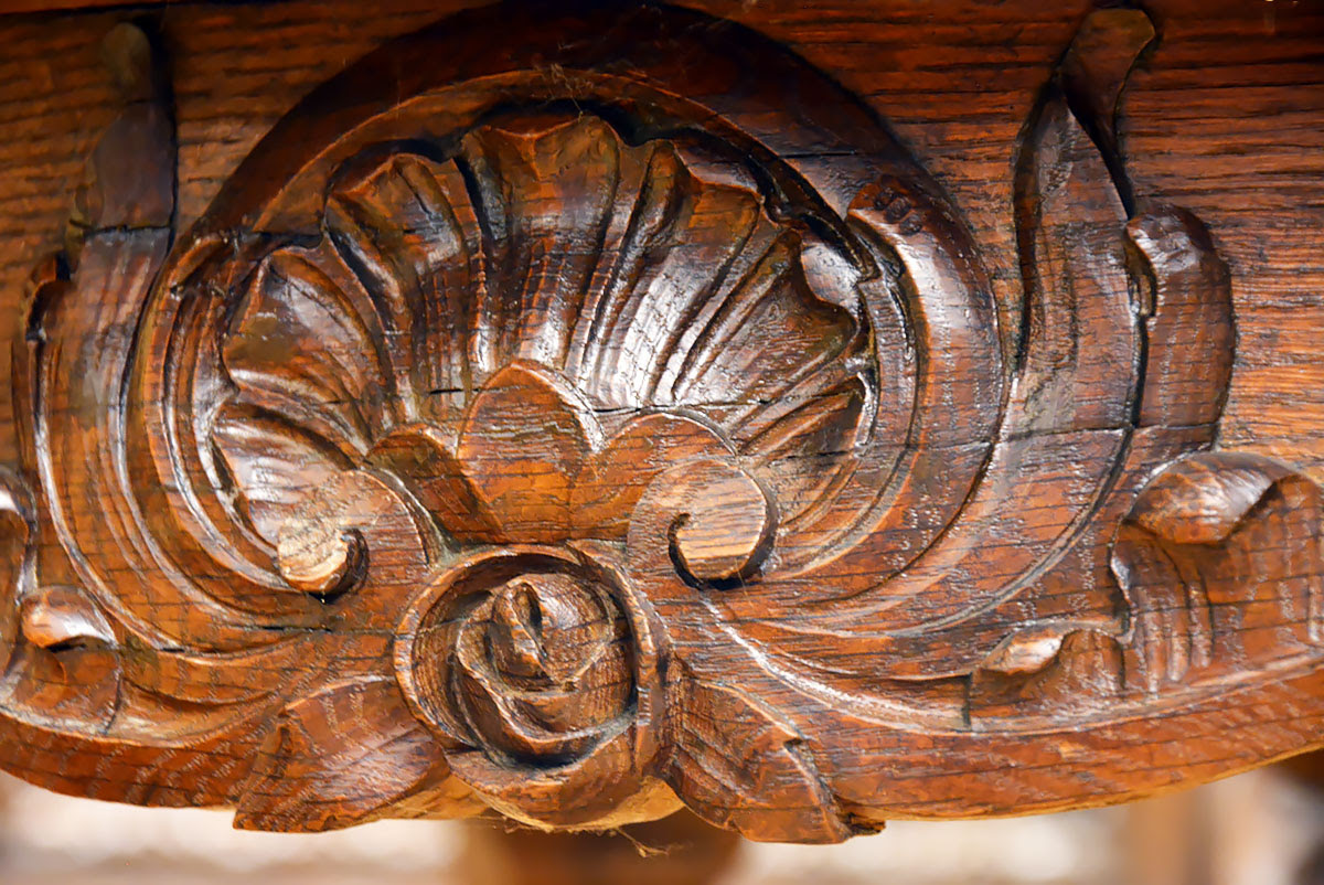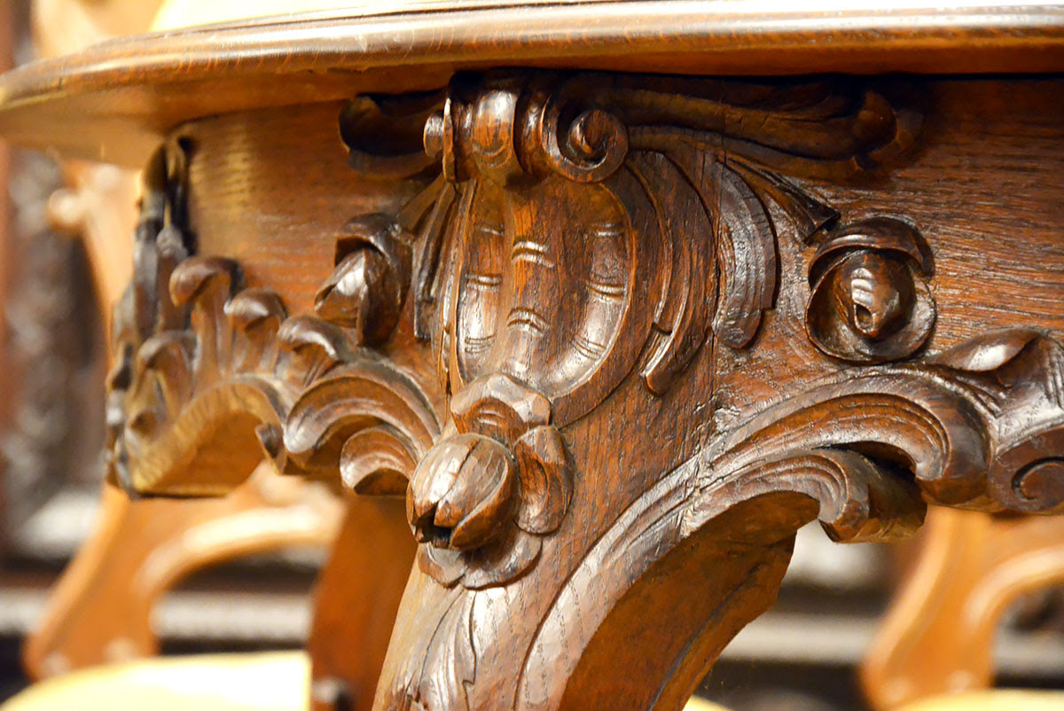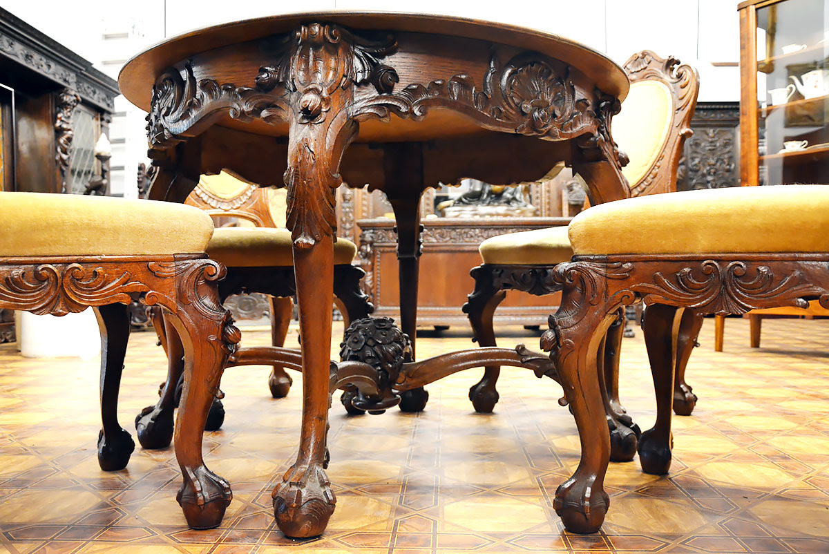 Stół i krzesła zdobi przepiękna, rzadko spotykana snycerka, dzięki której komplet prezentuje się niezwykle efektownie i stanowi ozdobę każdego wnętrza.