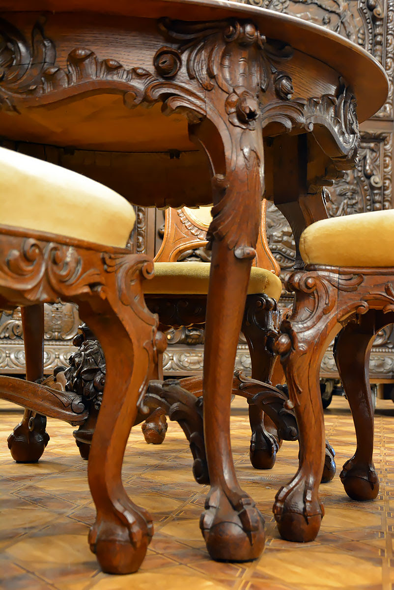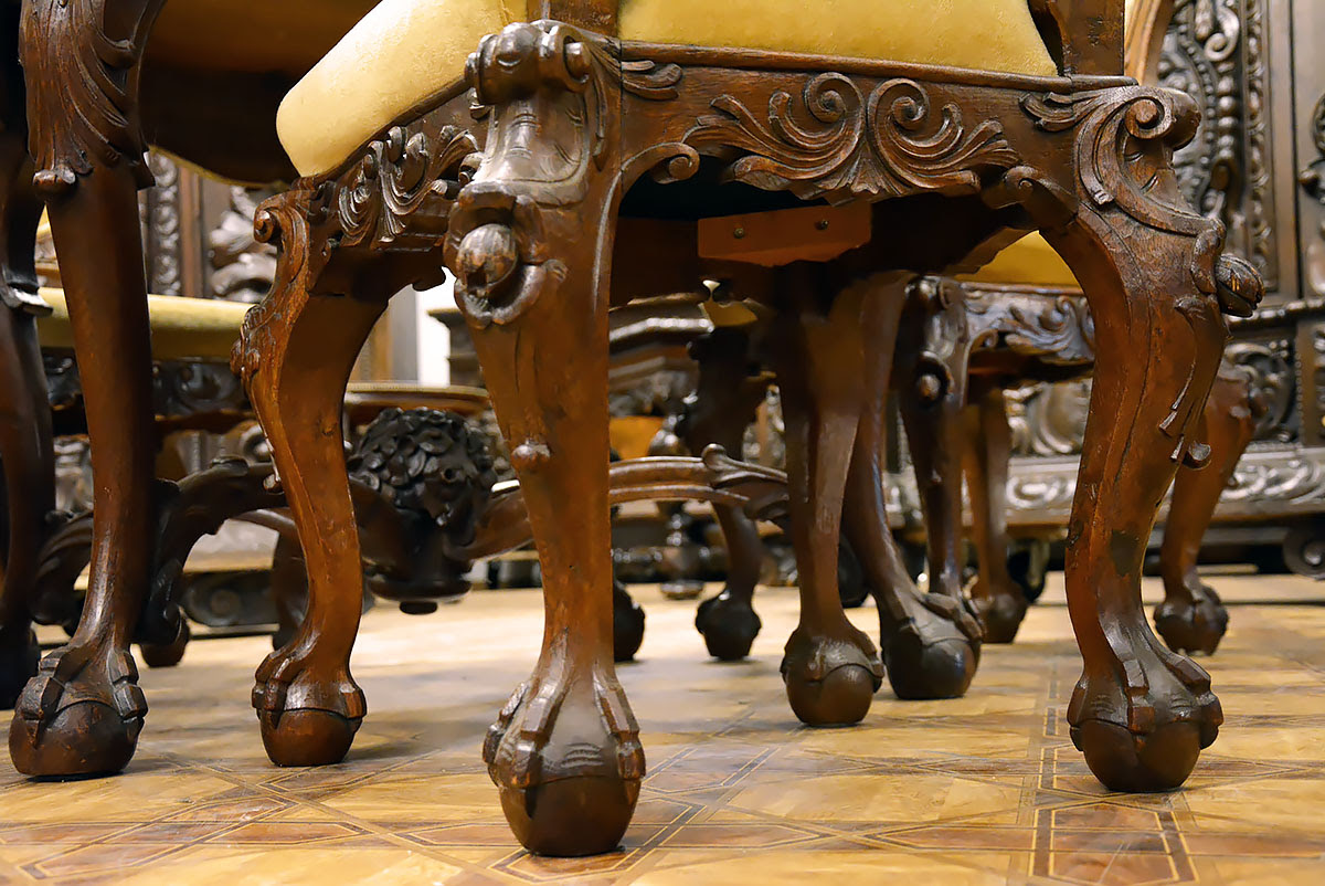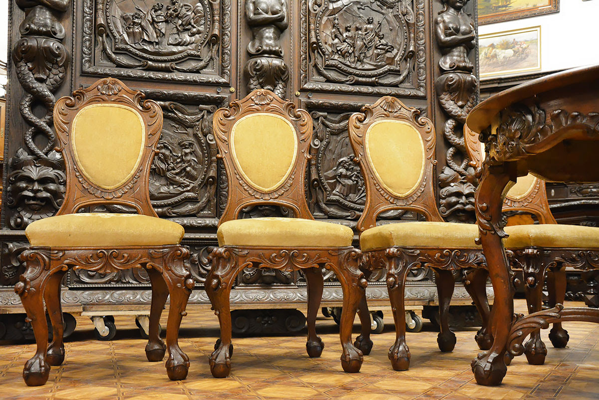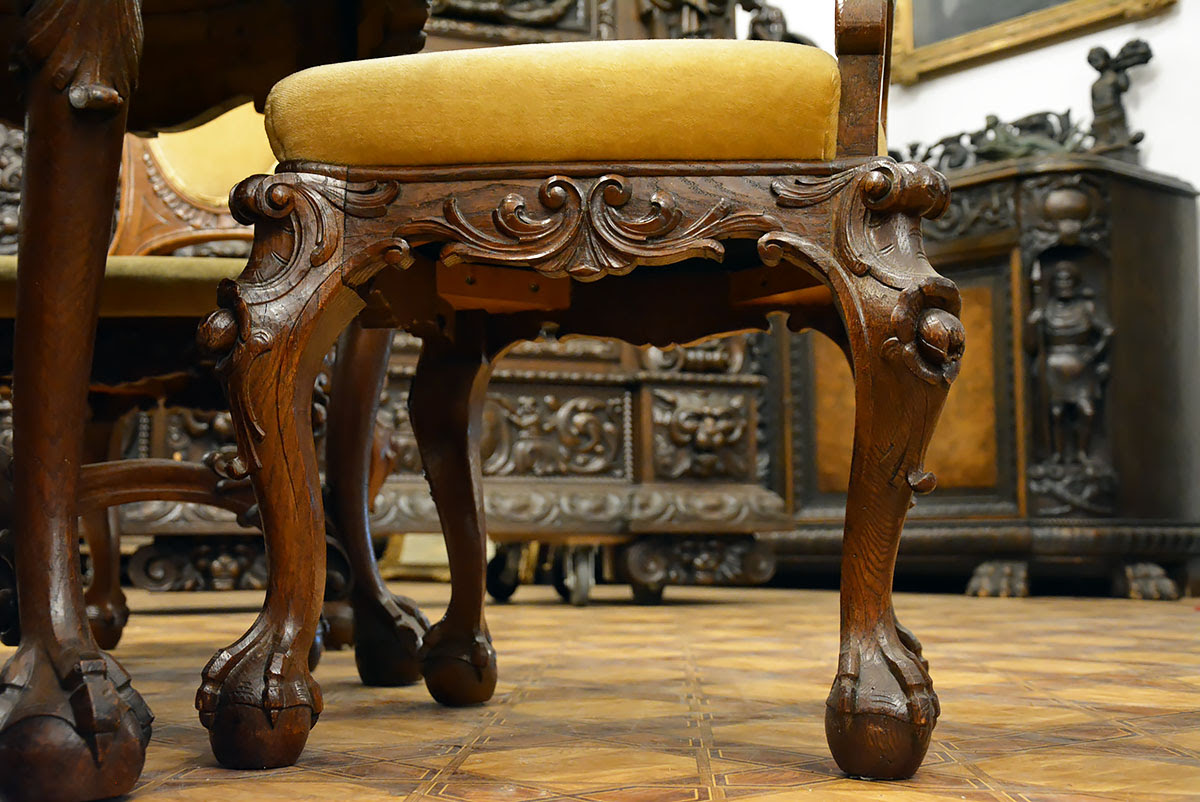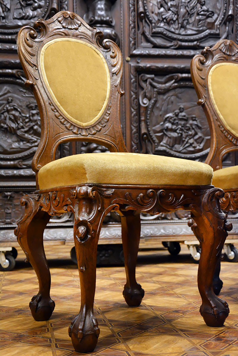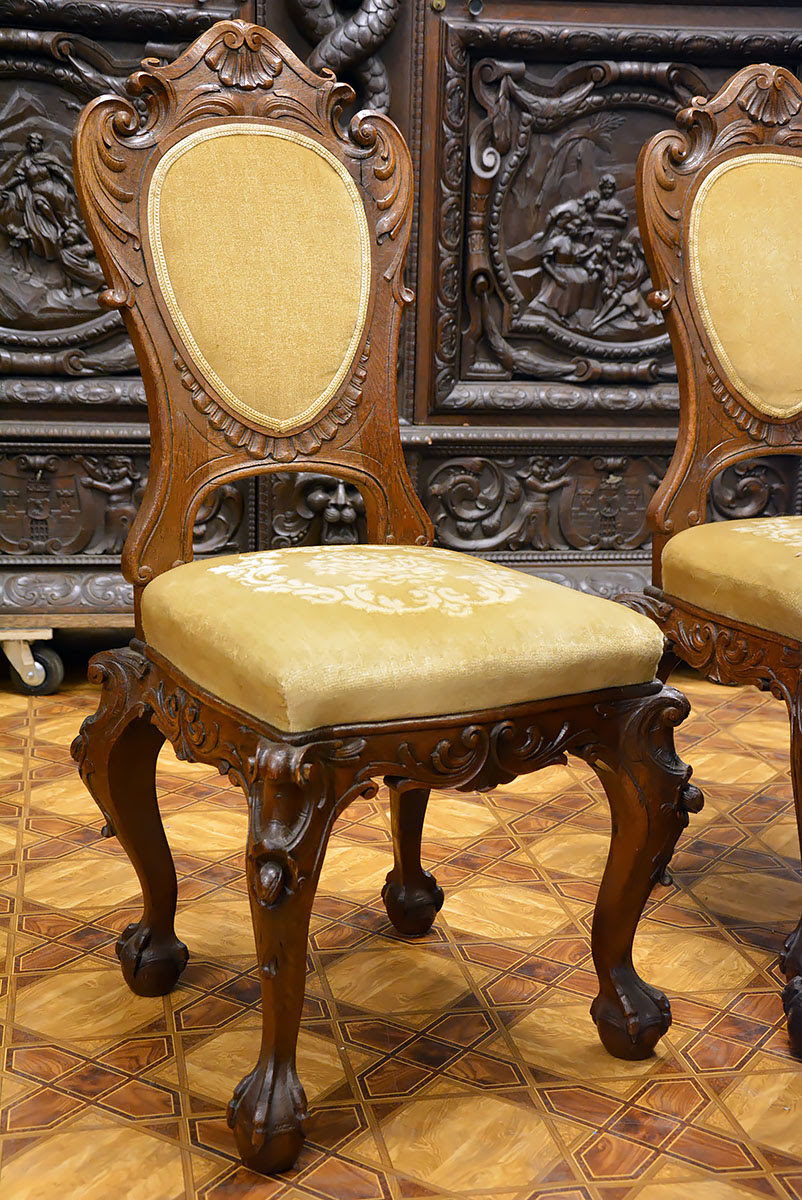Krzesła solidne, wygodne i dekoracyjne, nawiązujące zdobieniami do stołu. Posiadają kabriolowe nogi również zwieńczone kulami w orlich łapach.