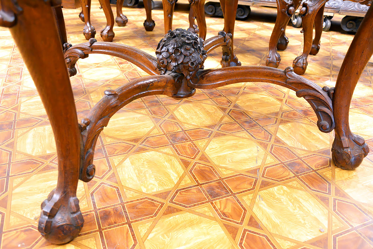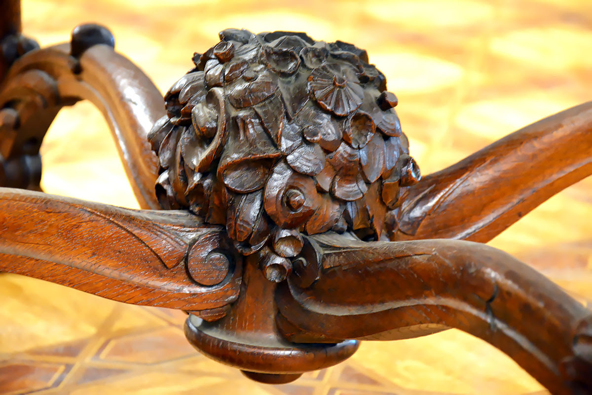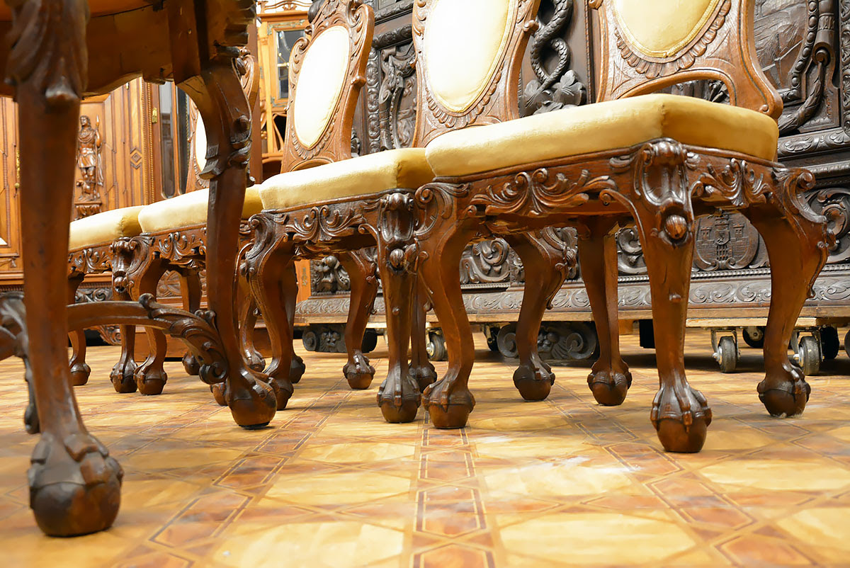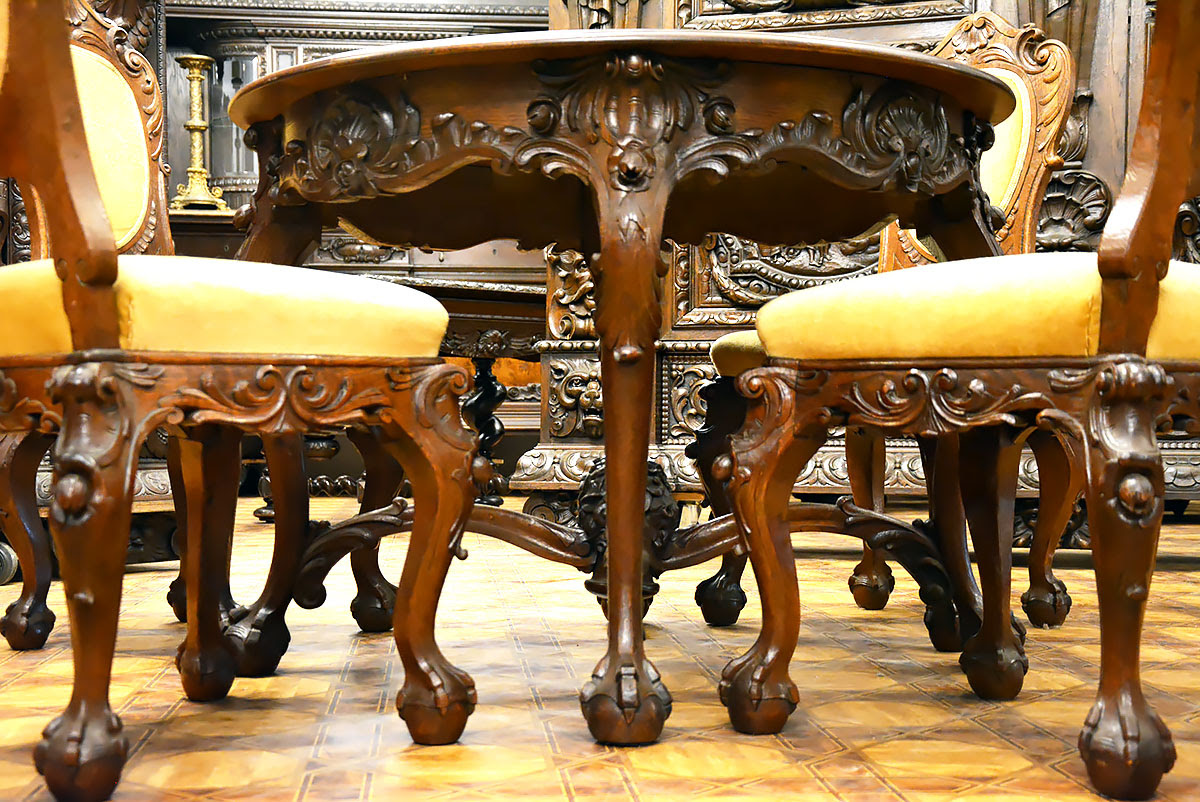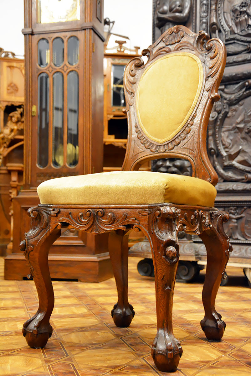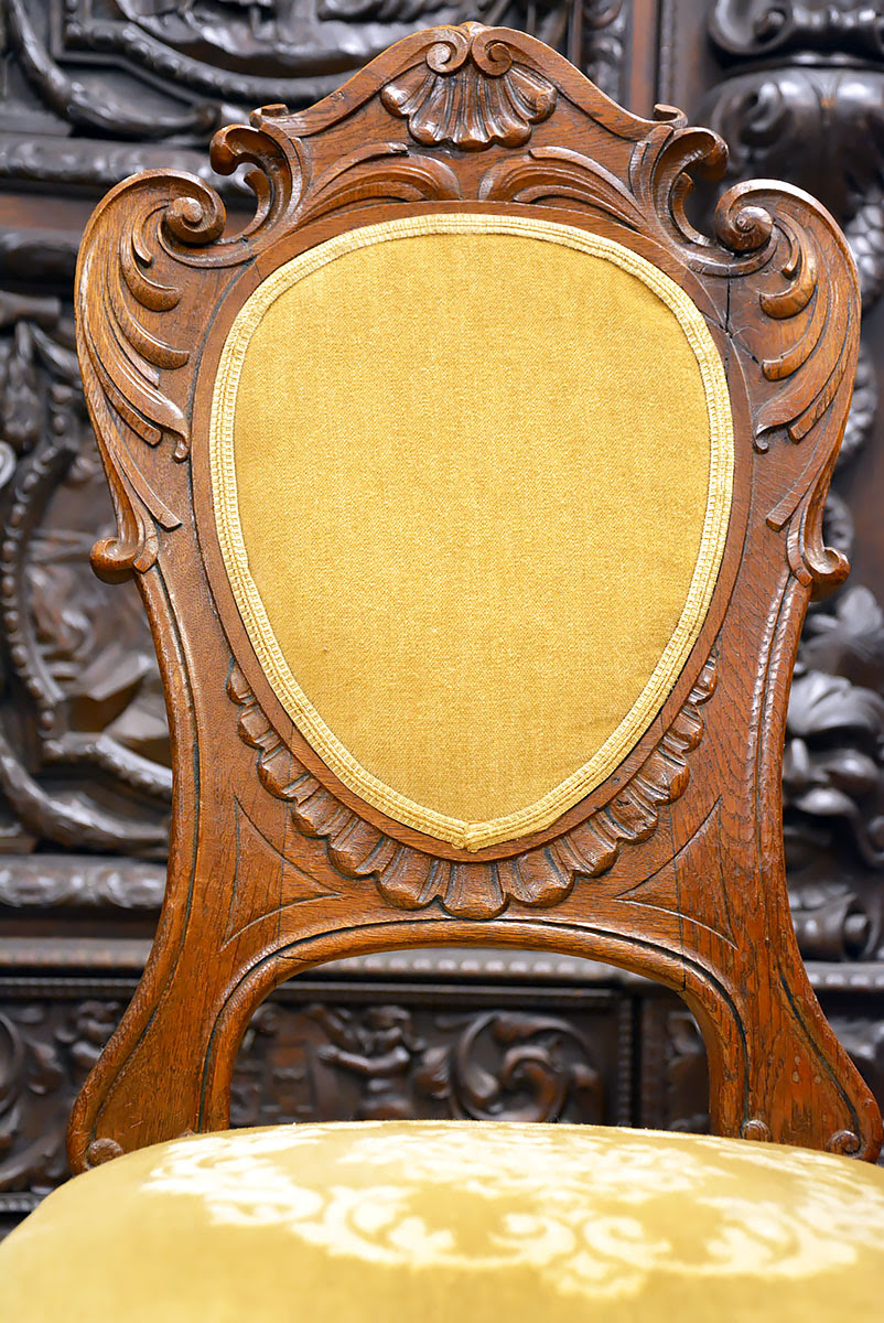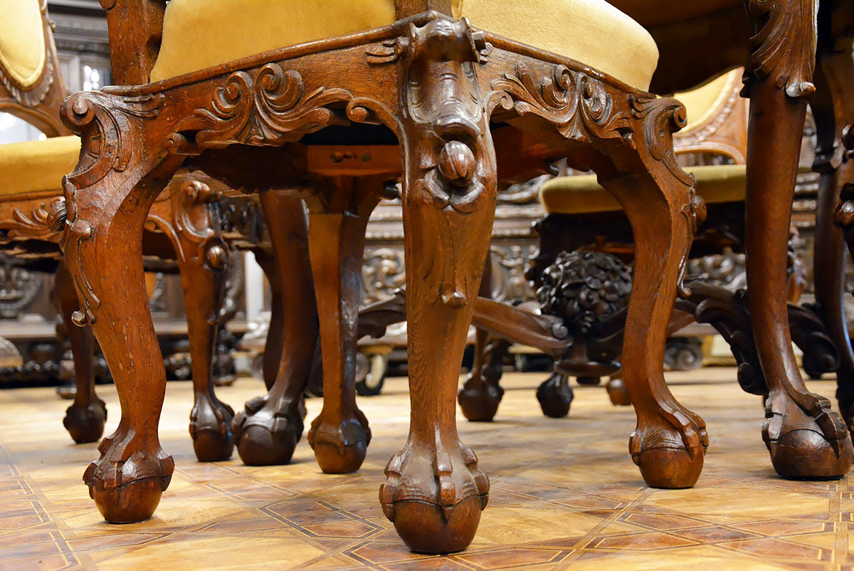 Krzesła solidne, wygodne i dekoracyjne, nawiązujące zdobieniami do stołu. Posiadają kabriolowe nogi również zwieńczone kulami w orlich łapach.