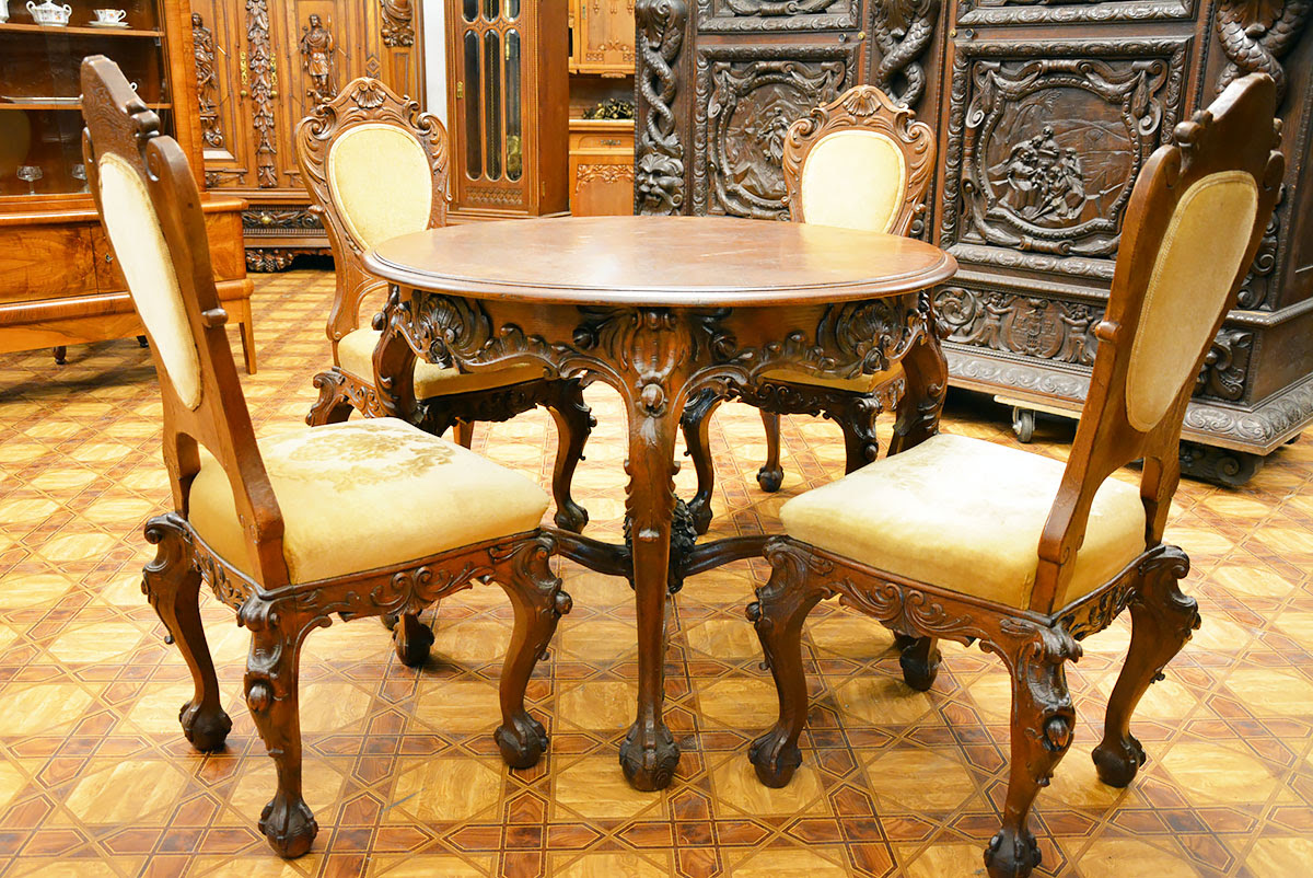 Stolik kawowy z kompletem czterech krzeseł w stylu neobarokowym, datowane na ok. 1890 rok.