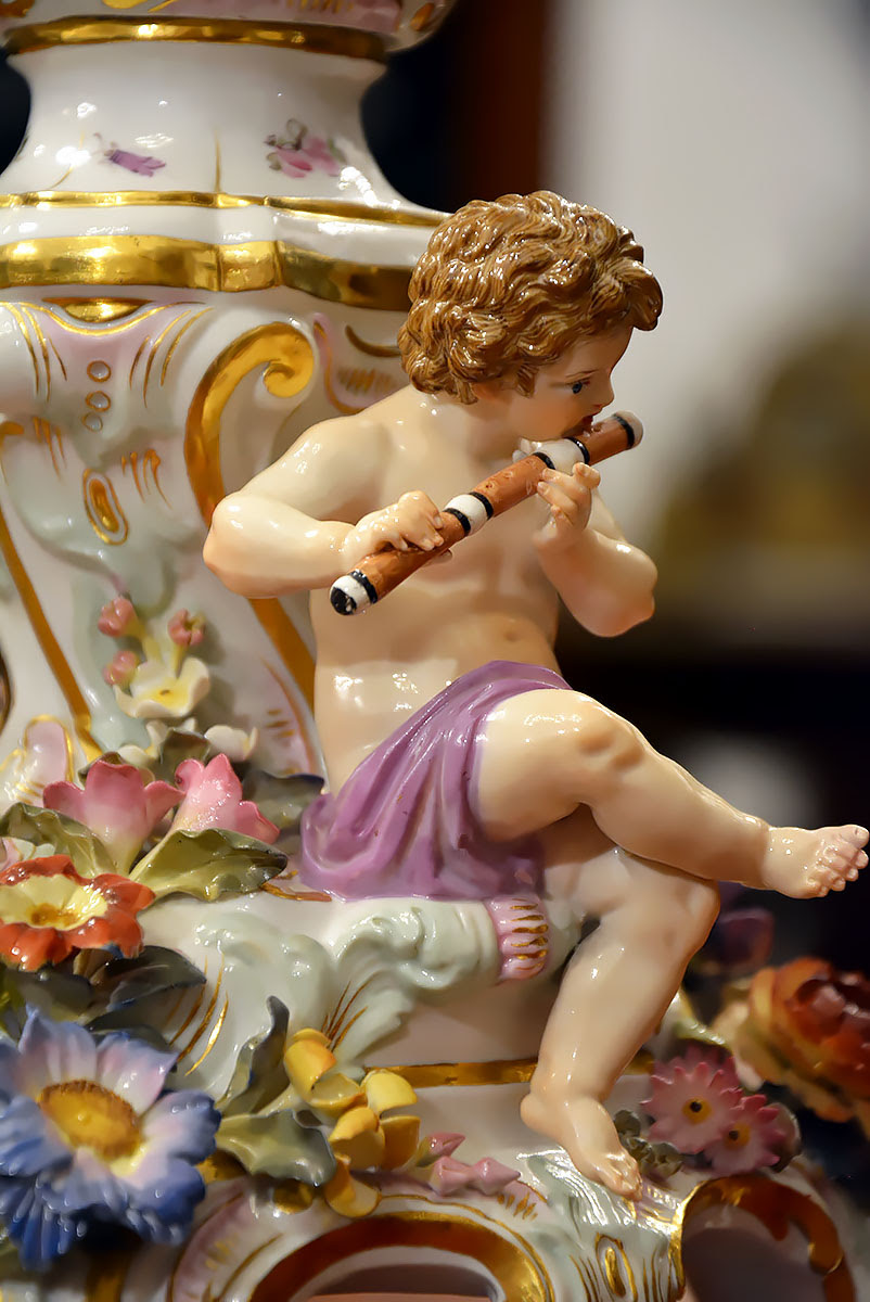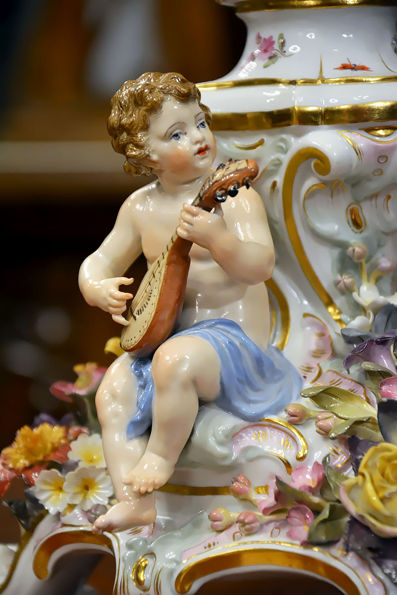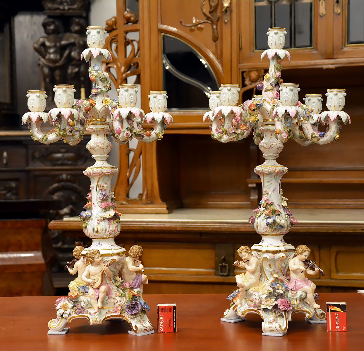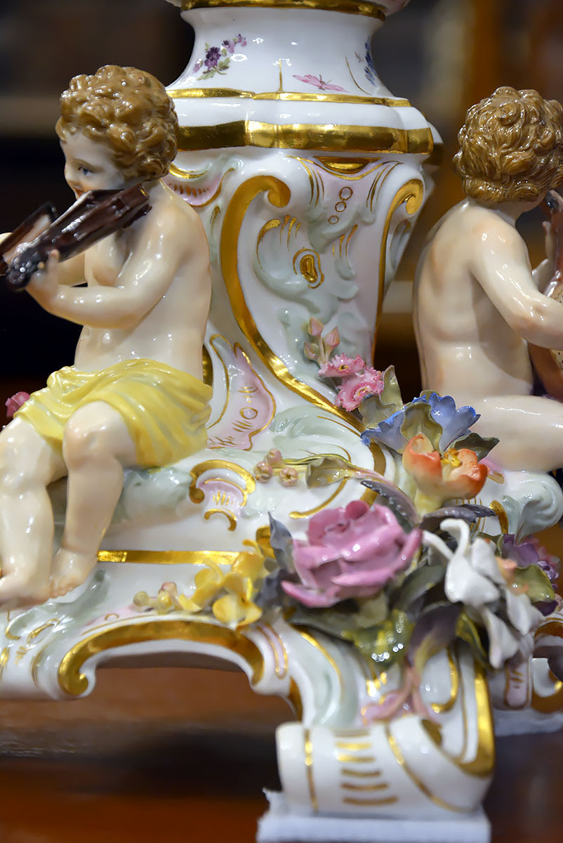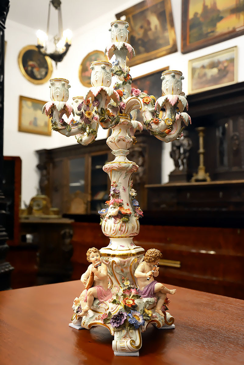 Okazałe – aż 58 cm wysokości !!! , niezwykle dekoracyjne świeczniki o wyraźnie barokowym, reprezentacyjnym charakterze, bogato zdobione licznymi rocaillami, plastycznymi aplikacjami floralnymi oraz pełnoplastycznymi figurkami muzykujących puttów z instrumentami, takimi jak lutnia, skrzypce oraz flet poprzeczny.