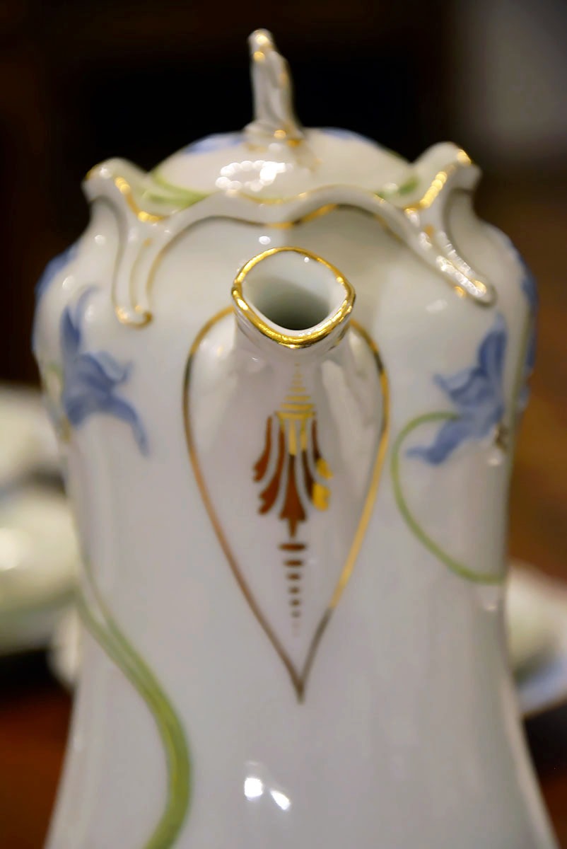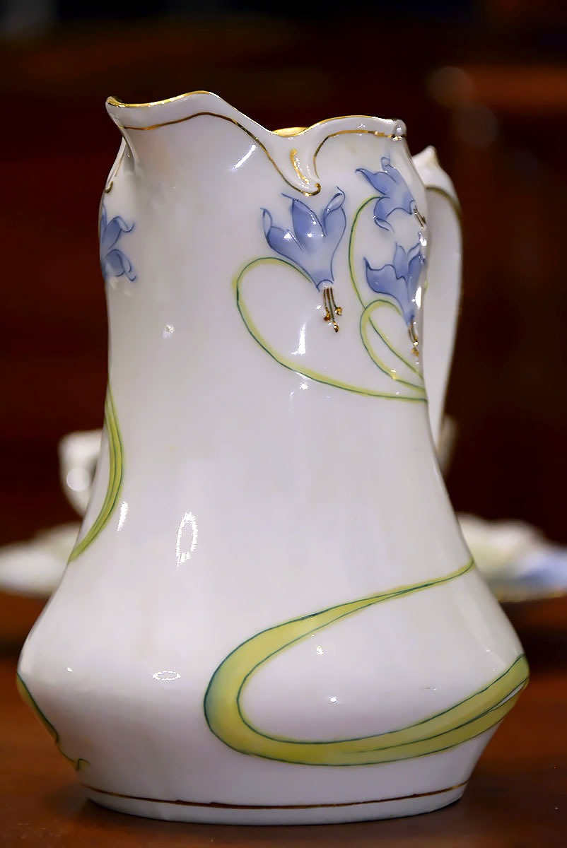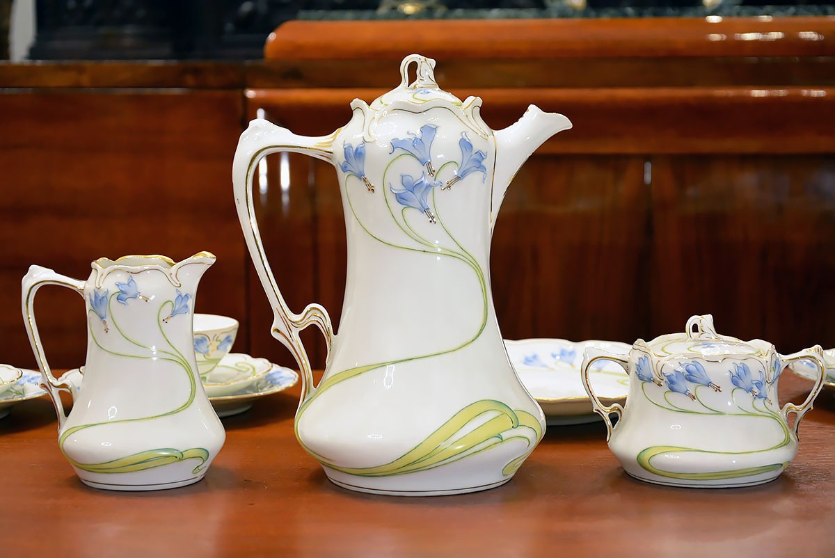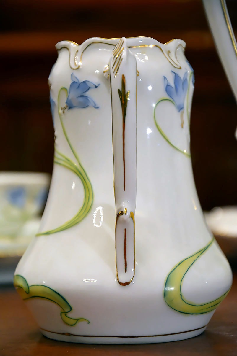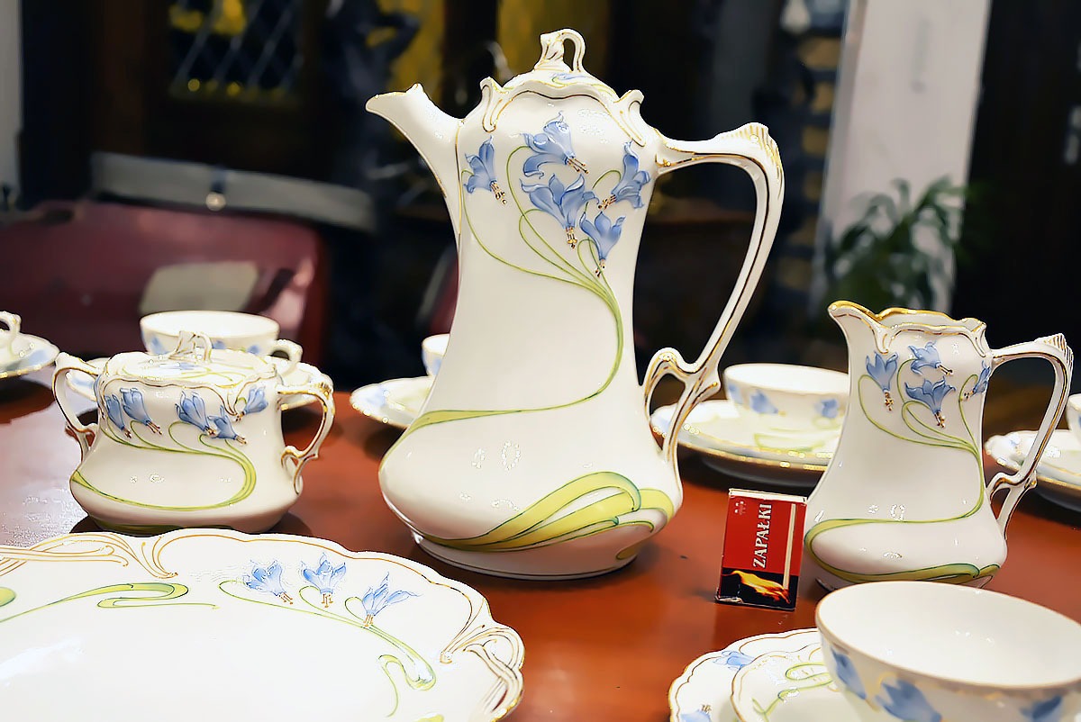 Prezentowany zestaw jest doskonałym przykładem secesyjnego wzornictwa (Jugendstil), w którym forma i dekor tworzą spójną, organiczną całość. Charakterystyczna dla tego okresu miękka, falująca linia widoczna jest zarówno w profilach naczyń, jak i w subtelnie modelowanych uchwytach oraz krawędziach.