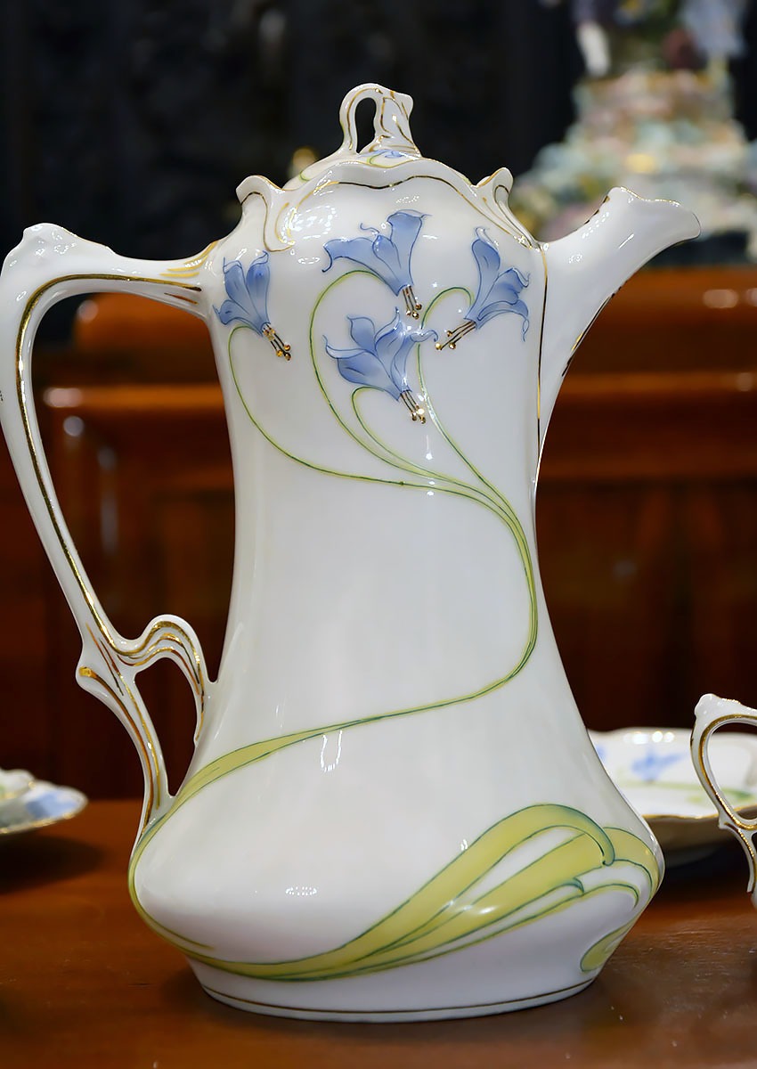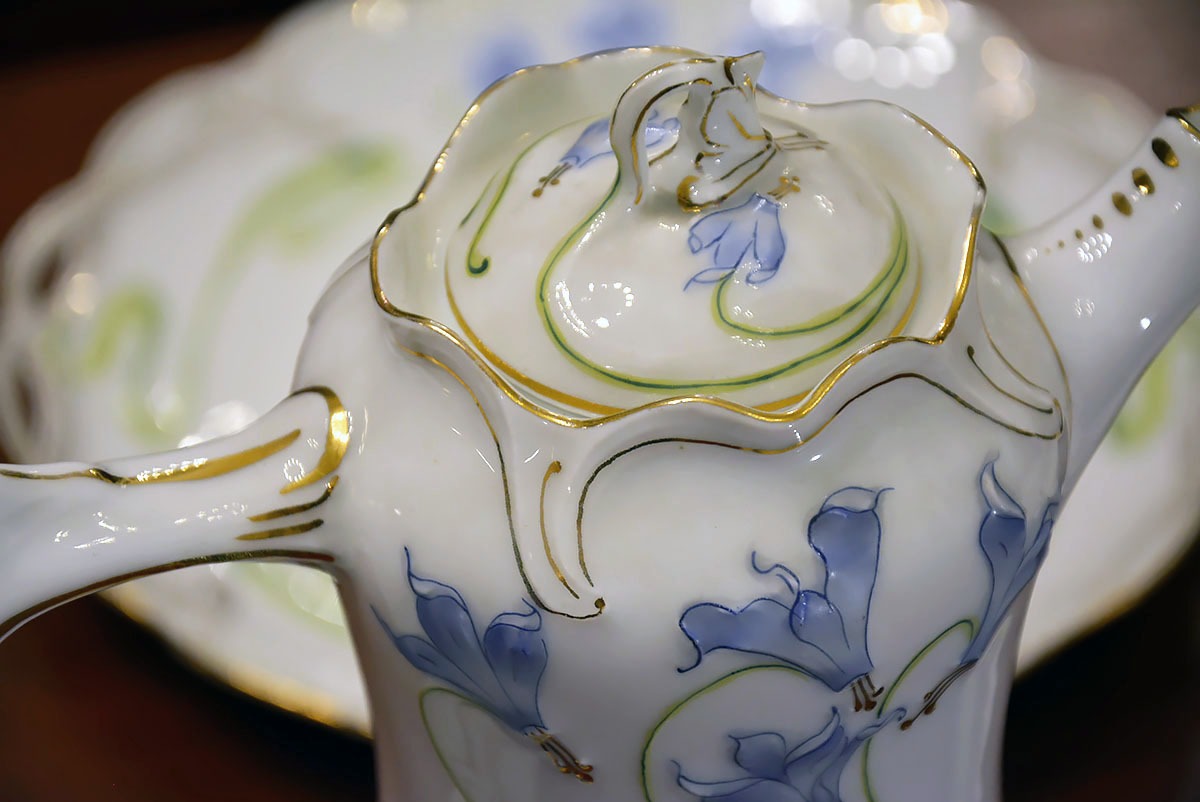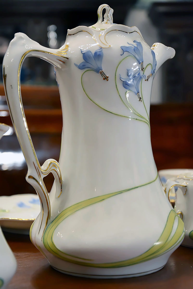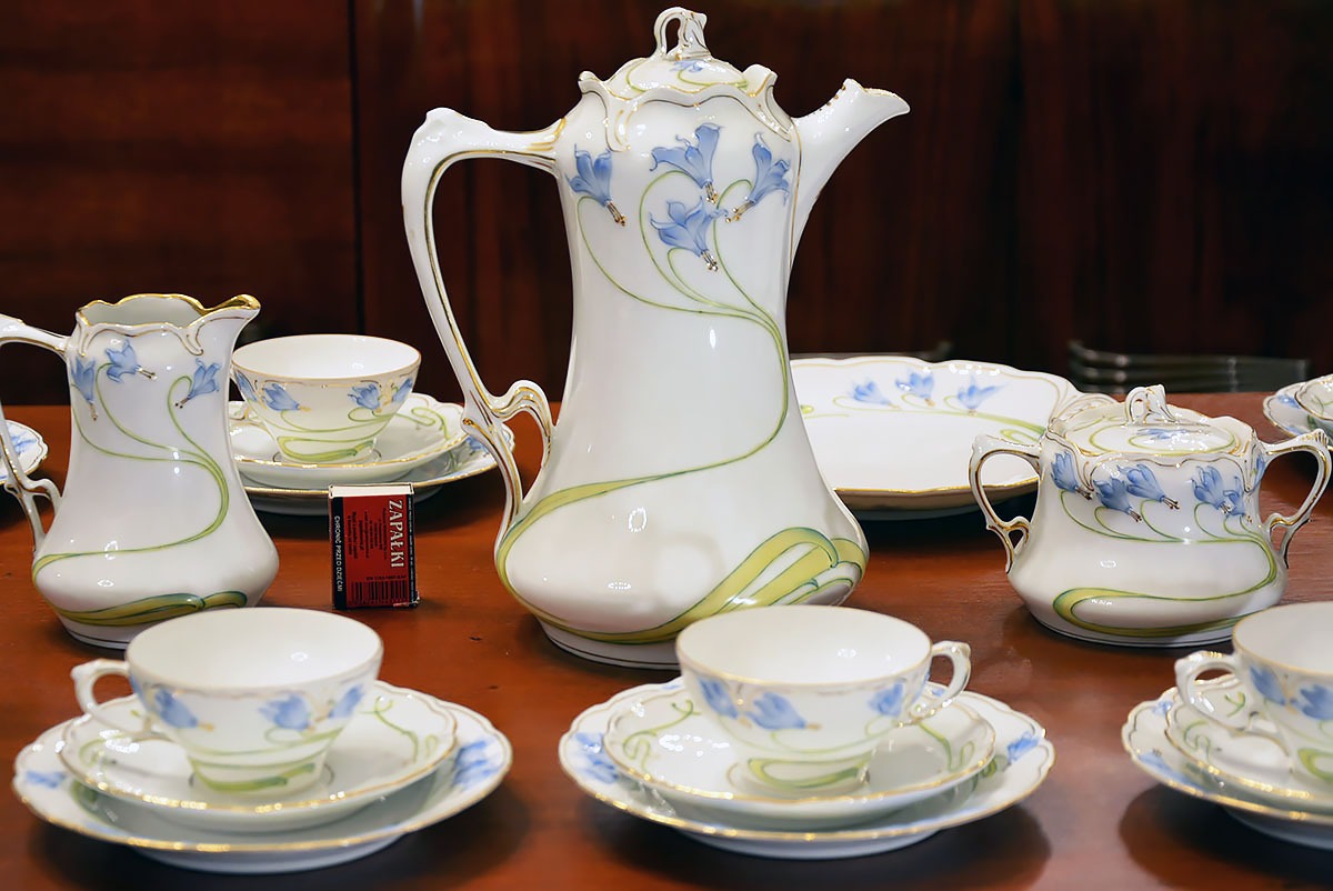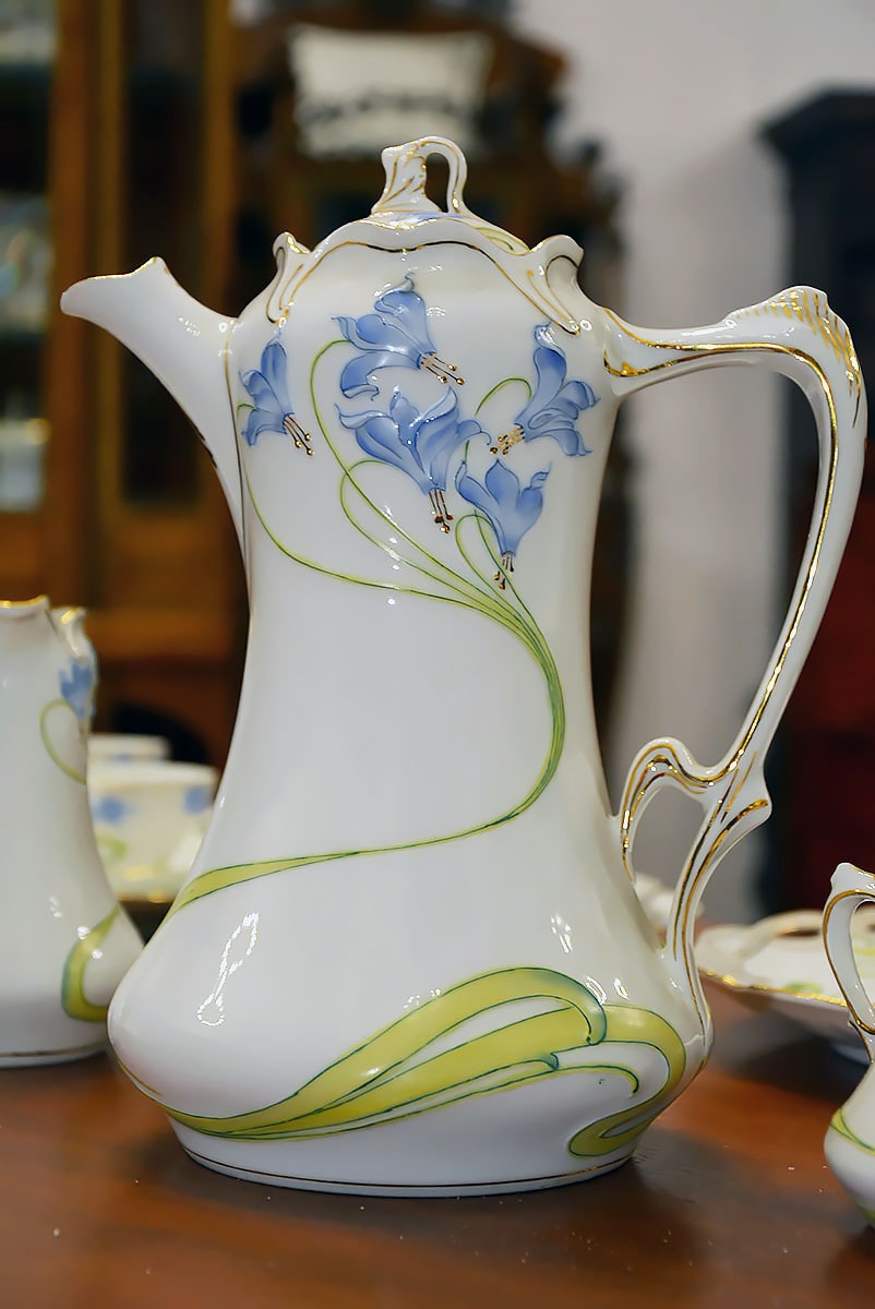 Prezentowany zestaw jest doskonałym przykładem secesyjnego wzornictwa (Jugendstil), w którym forma i dekor tworzą spójną, organiczną całość. Charakterystyczna dla tego okresu miękka, falująca linia widoczna jest zarówno w profilach naczyń, jak i w subtelnie modelowanych uchwytach oraz krawędziach.