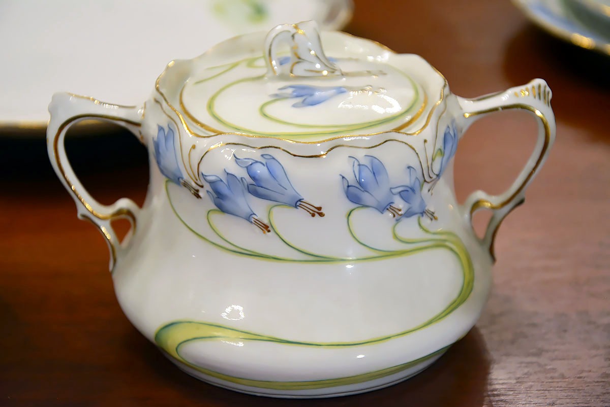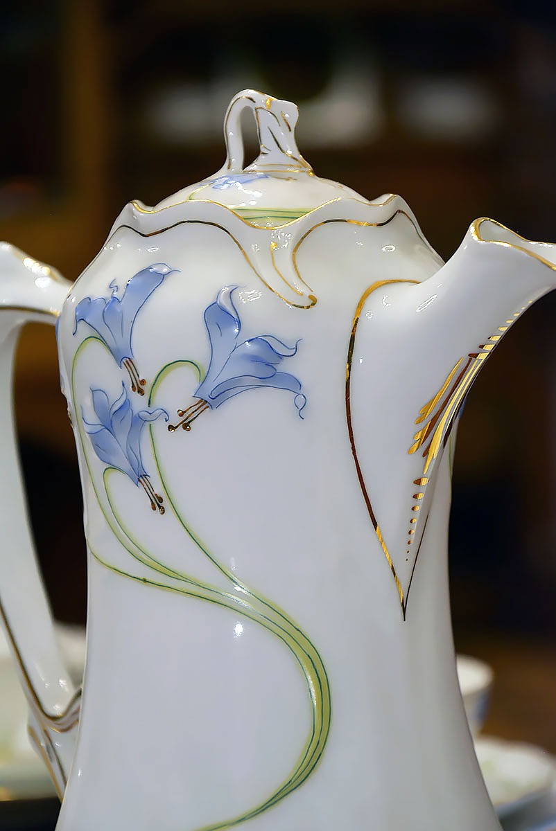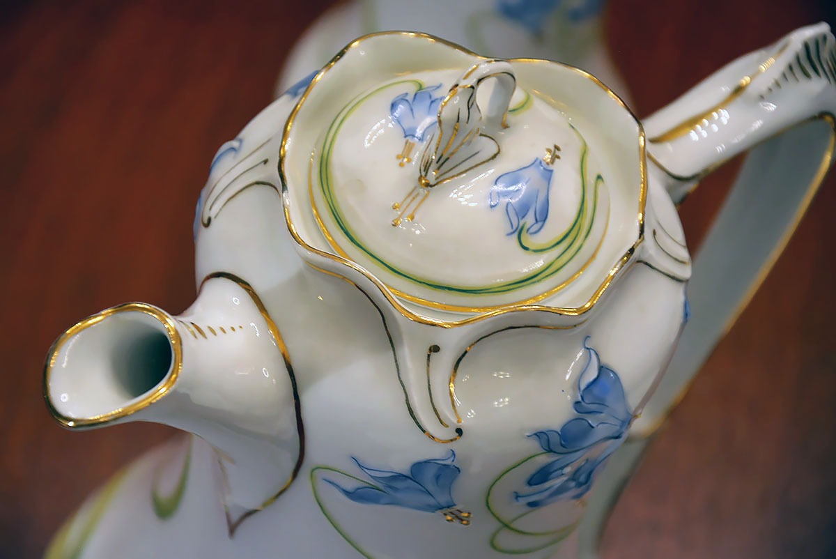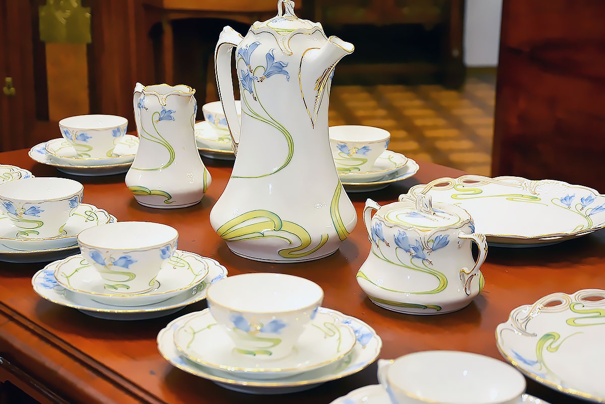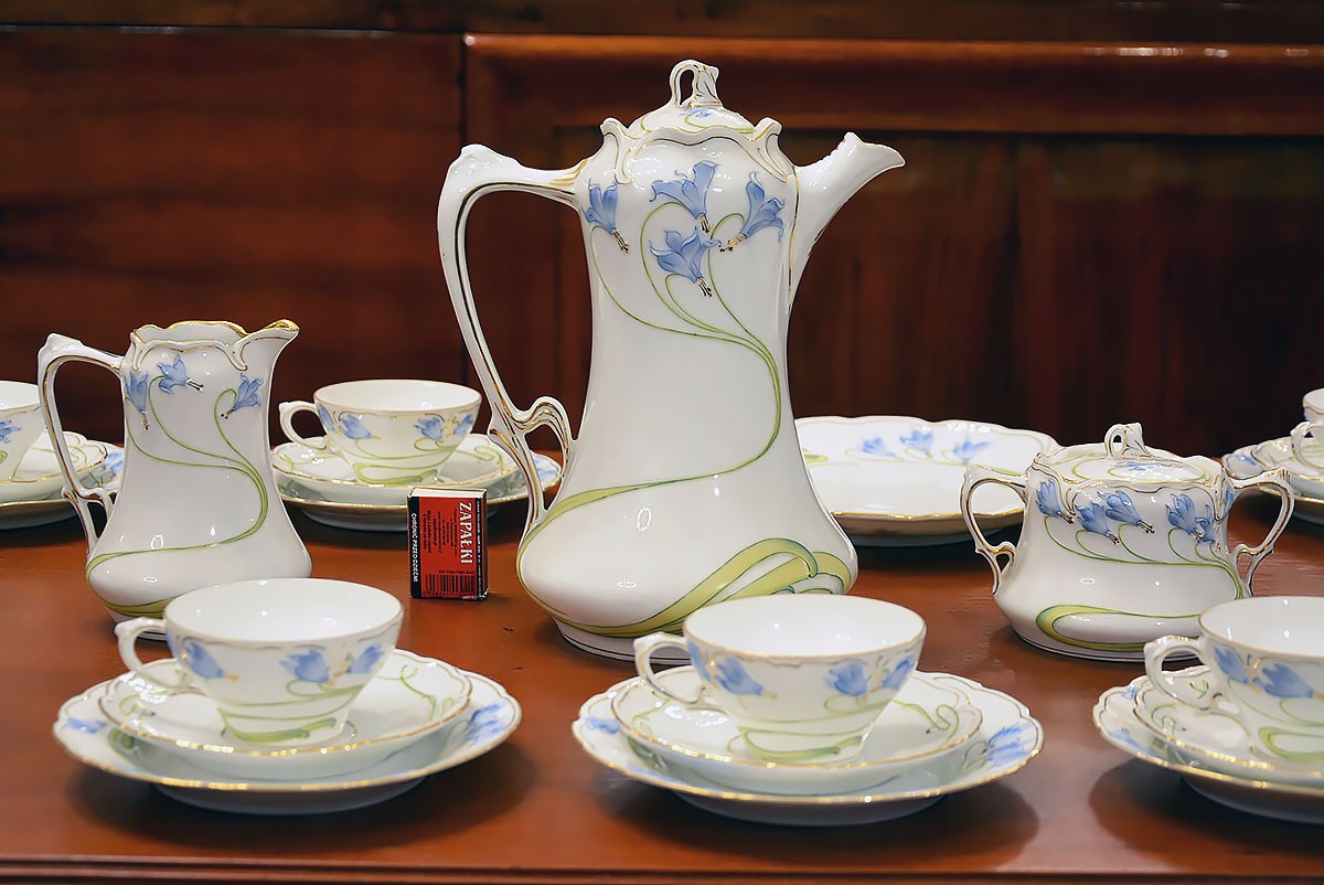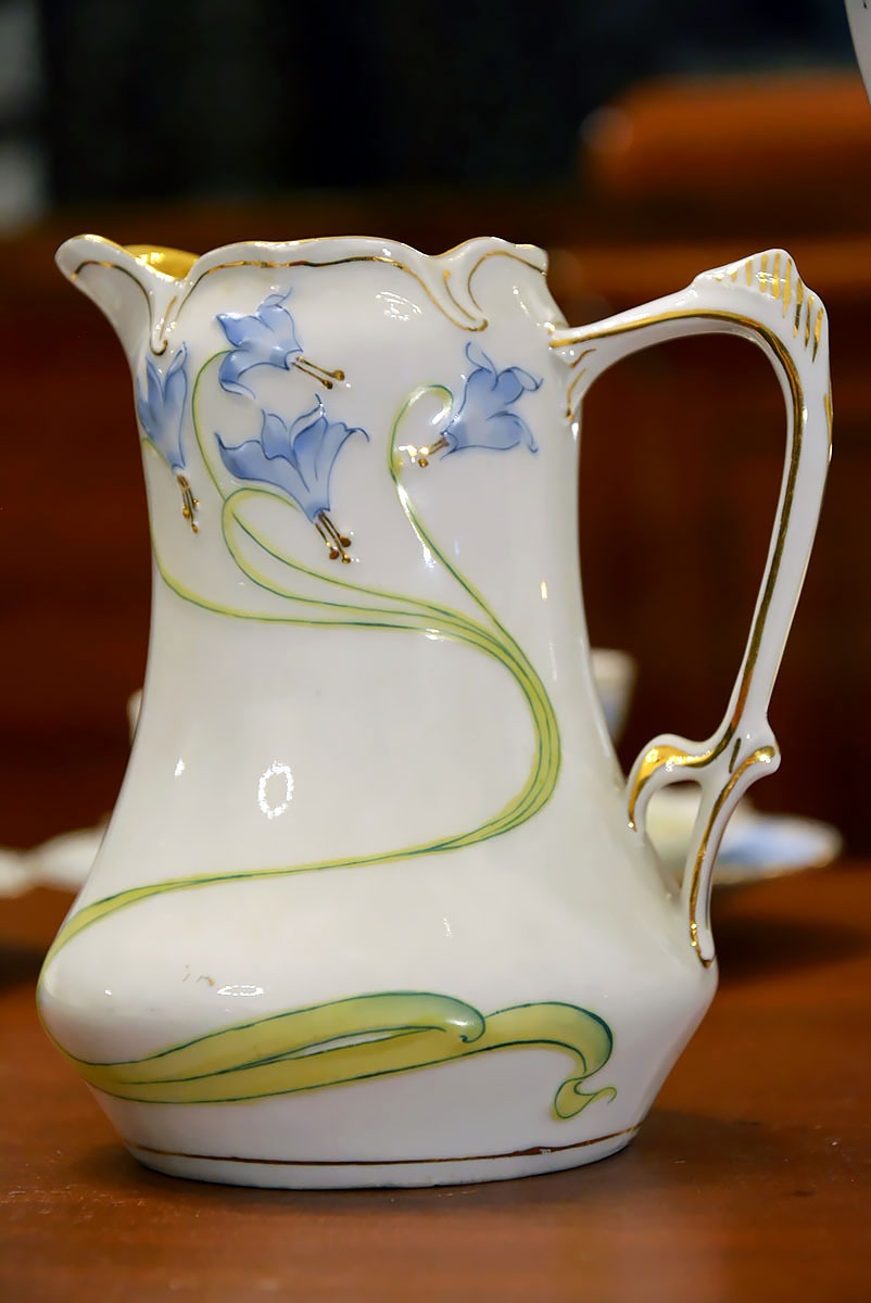 Prezentowany zestaw jest doskonałym przykładem secesyjnego wzornictwa (Jugendstil), w którym forma i dekor tworzą spójną, organiczną całość. Charakterystyczna dla tego okresu miękka, falująca linia widoczna jest zarówno w profilach naczyń, jak i w subtelnie modelowanych uchwytach oraz krawędziach.