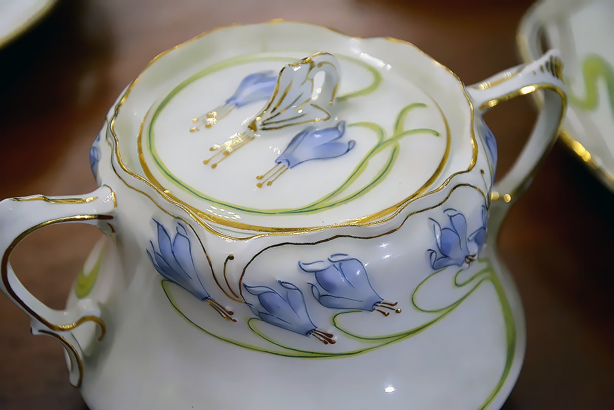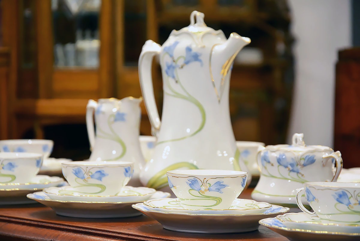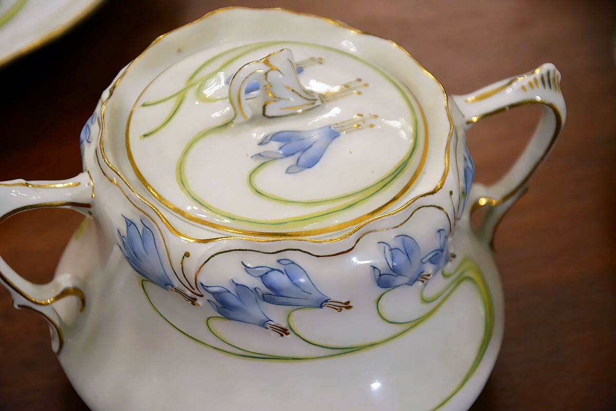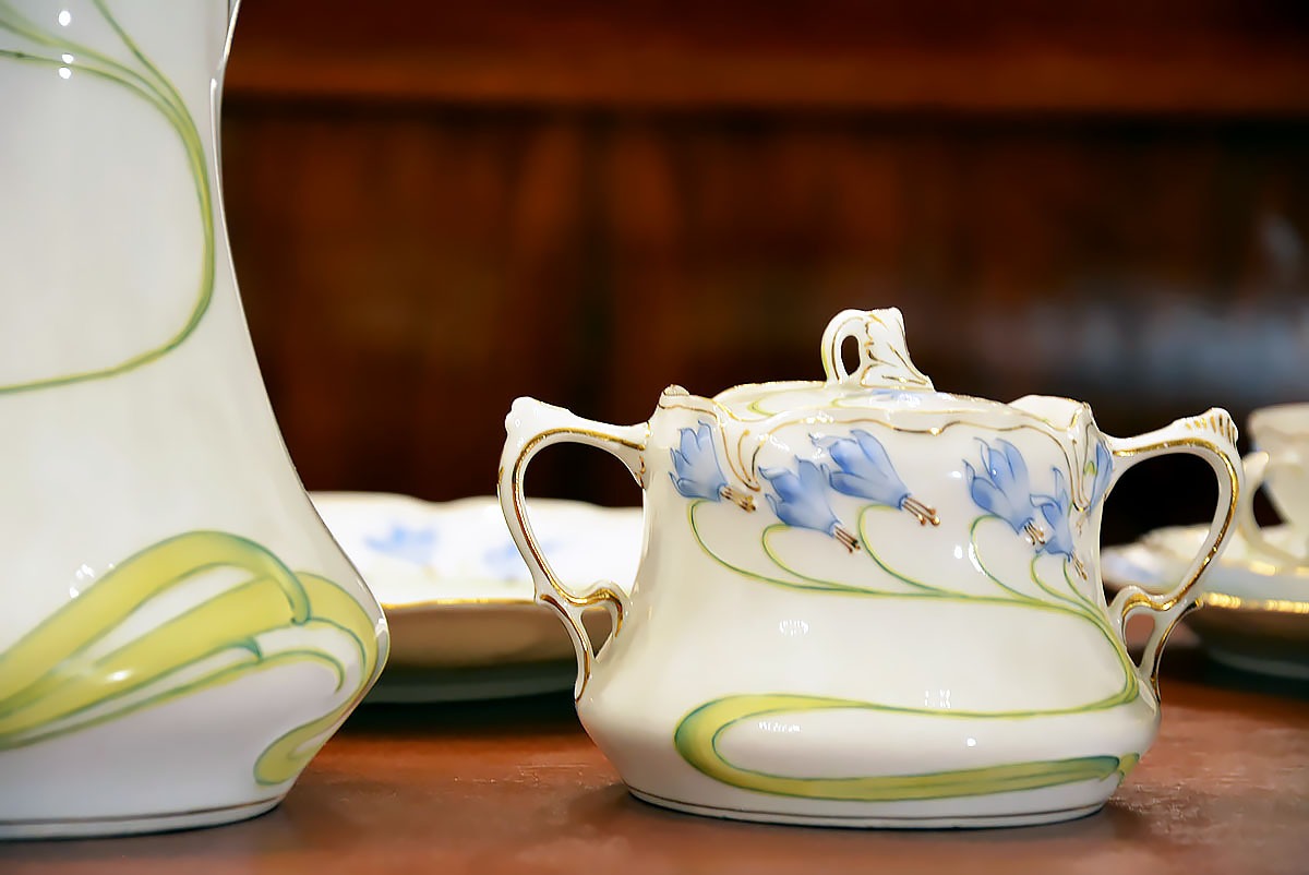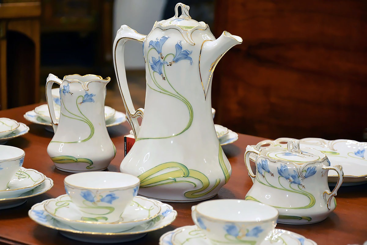 Prezentowany zestaw jest doskonałym przykładem secesyjnego wzornictwa (Jugendstil), w którym forma i dekor tworzą spójną, organiczną całość. Charakterystyczna dla tego okresu miękka, falująca linia widoczna jest zarówno w profilach naczyń, jak i w subtelnie modelowanych uchwytach oraz krawędziach.