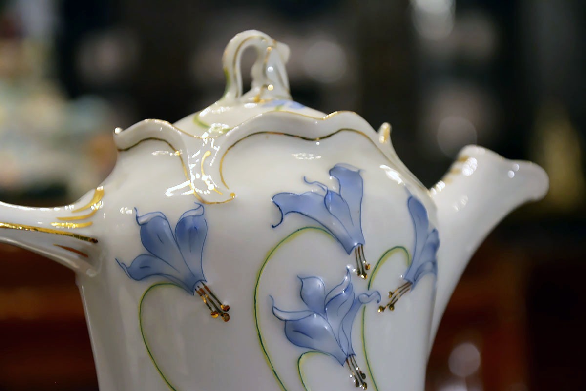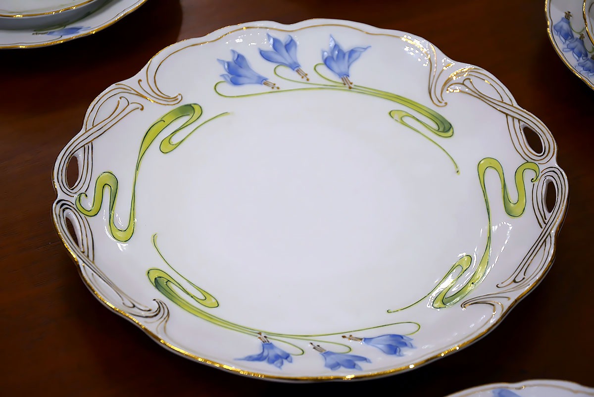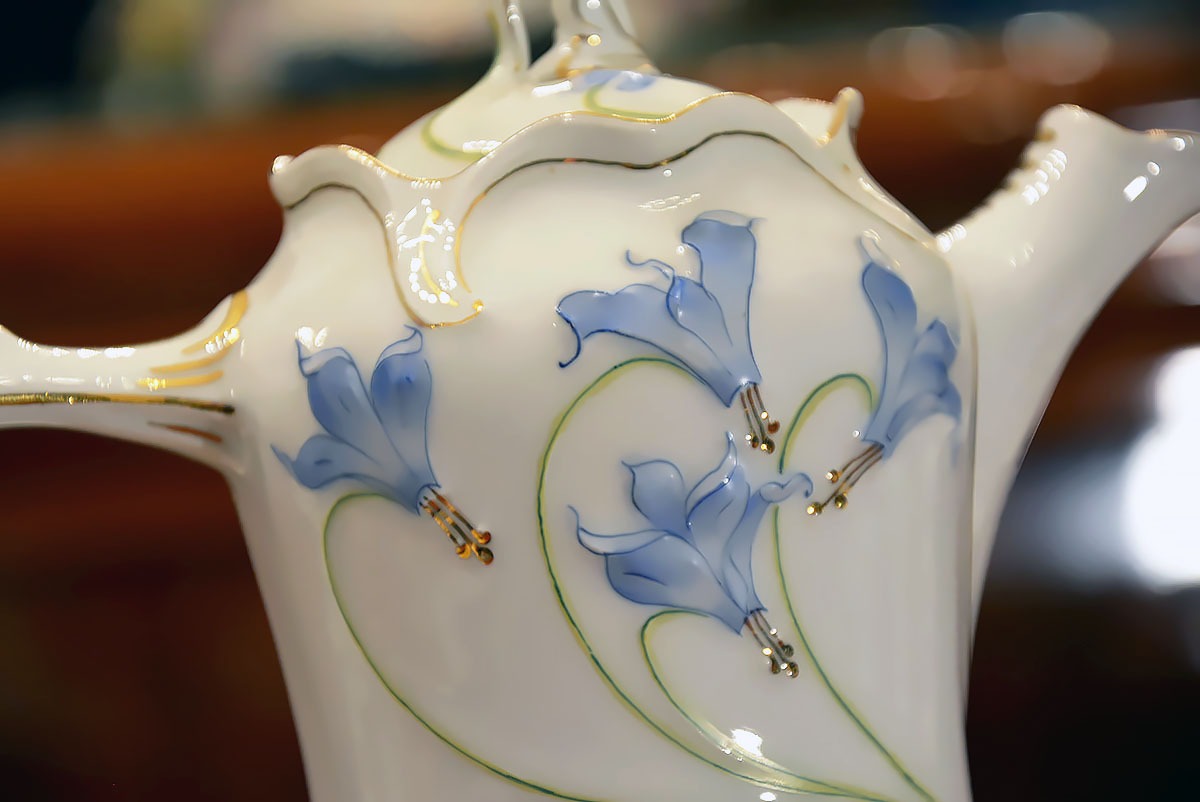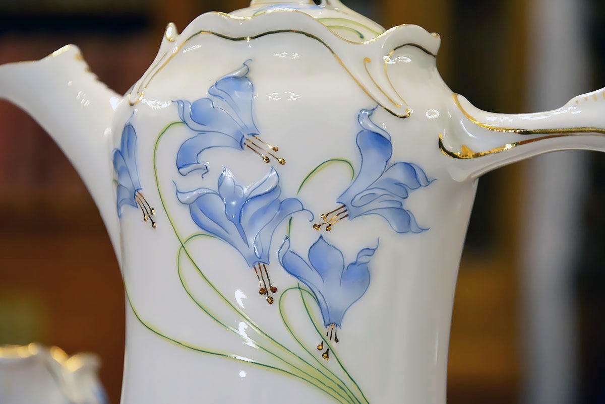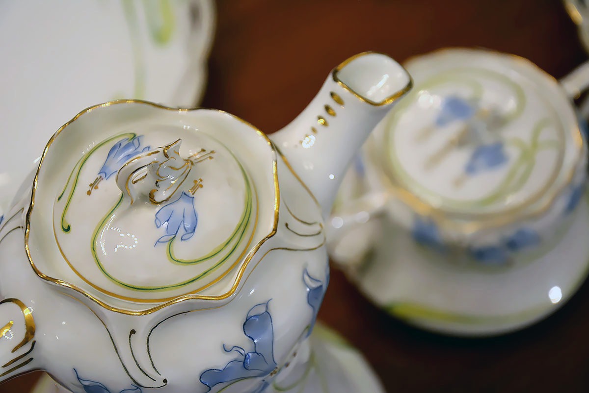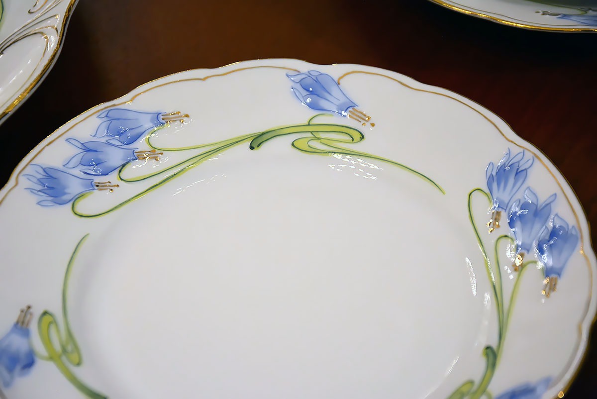 Porcelana utrzymana jest w eleganckim, klasycznym odcieniu czystej bieli, który stanowi idealne tło dla dekoracji i podkreśla lekkość formy. Motyw roślinny stylizowanych dzwonków (campanula) nie jest jedynie malowany – kwiaty zostały dodatkowo delikatnie wyprowadzone w reliefie, co nadaje im przestrzenności i wyjątkowej subtelnej plastyki. W połączeniu z ręcznie nanoszoną kolorystyką w odcieniach błękitu i zieleni oraz finezyjnymi złoceniami, dekor zyskuje głębię i szlachetność, widoczną szczególnie w świetle.