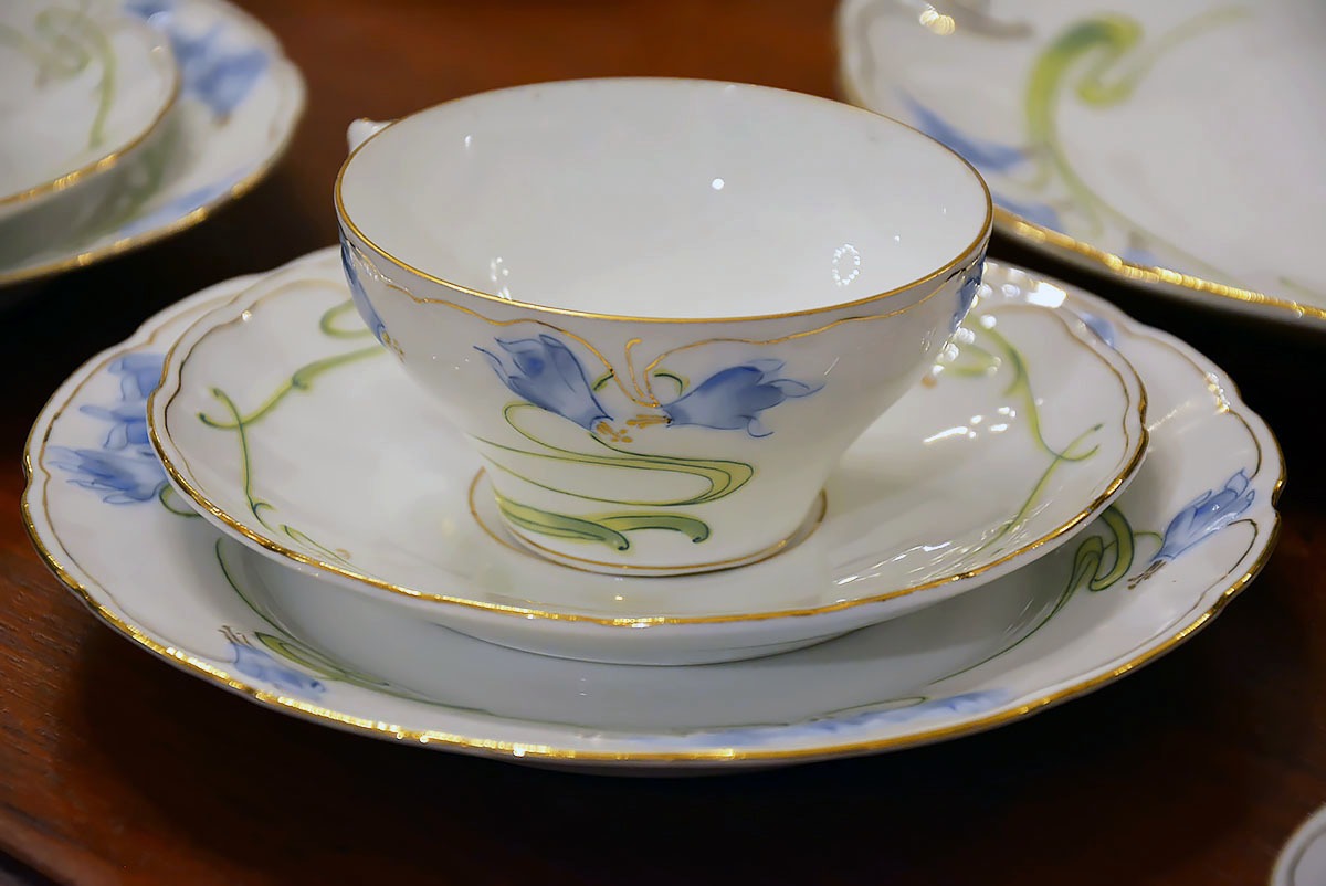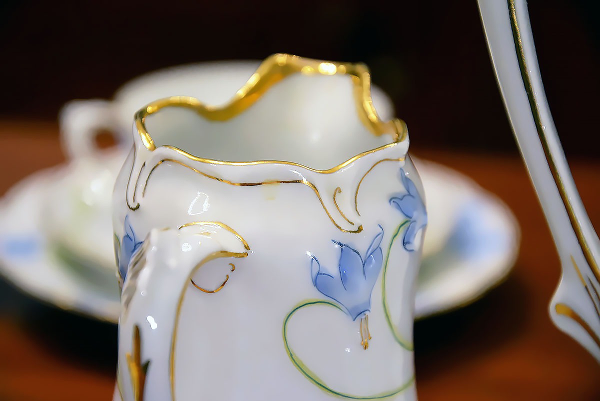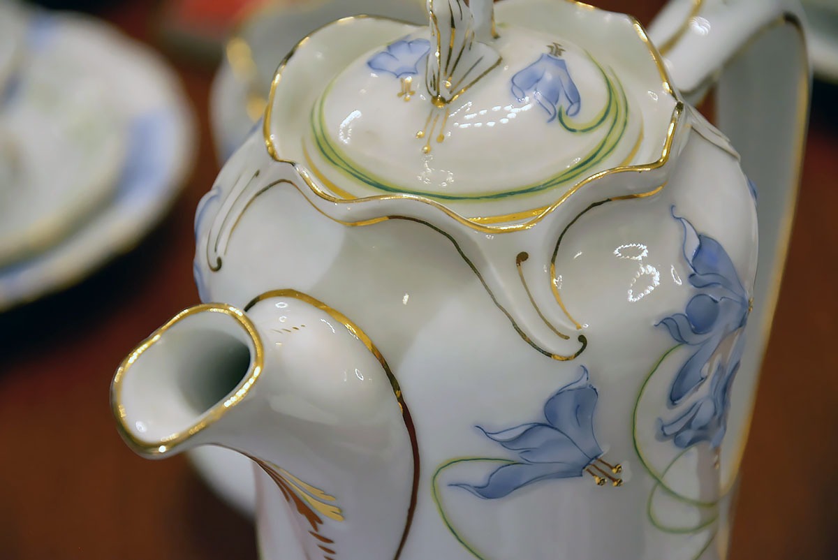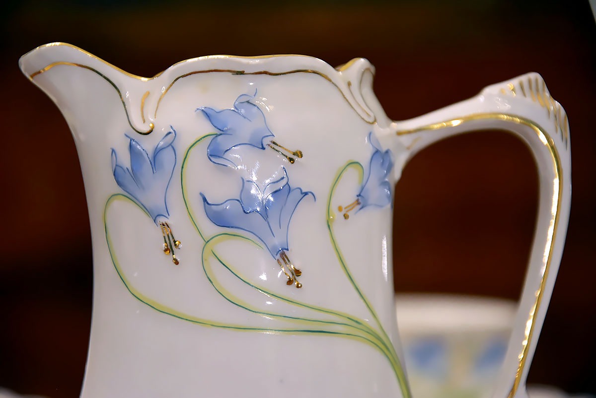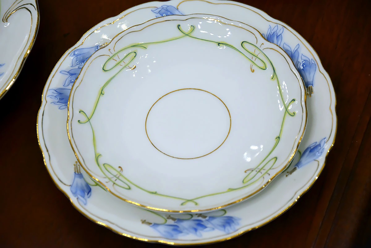 Porcelana utrzymana jest w eleganckim, klasycznym odcieniu czystej bieli, który stanowi idealne tło dla dekoracji i podkreśla lekkość formy. Motyw roślinny stylizowanych dzwonków (campanula) nie jest jedynie malowany – kwiaty zostały dodatkowo delikatnie wyprowadzone w reliefie, co nadaje im przestrzenności i wyjątkowej subtelnej plastyki. W połączeniu z ręcznie nanoszoną kolorystyką w odcieniach błękitu i zieleni oraz finezyjnymi złoceniami, dekor zyskuje głębię i szlachetność, widoczną szczególnie w świetle.