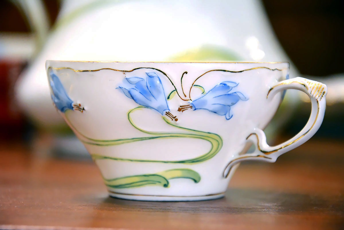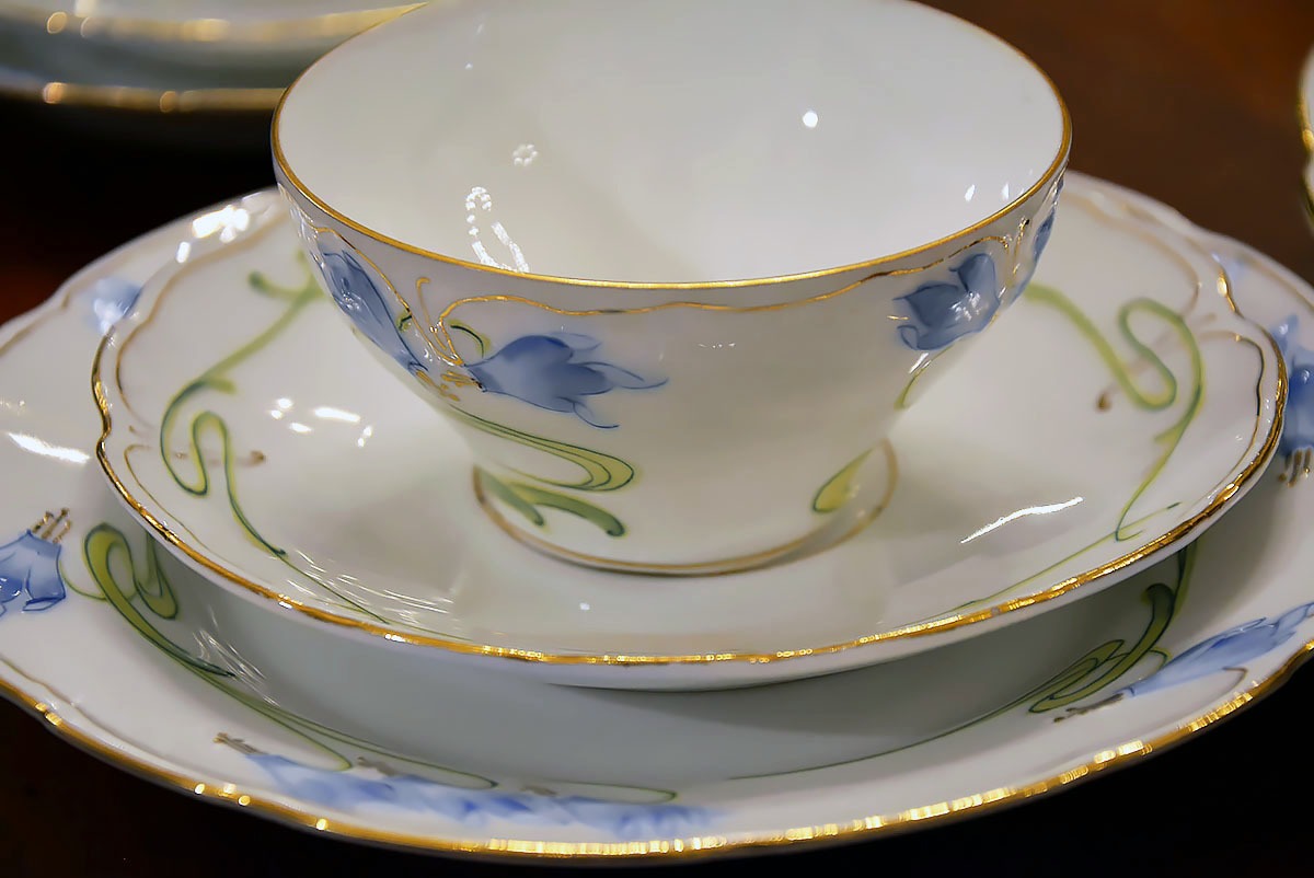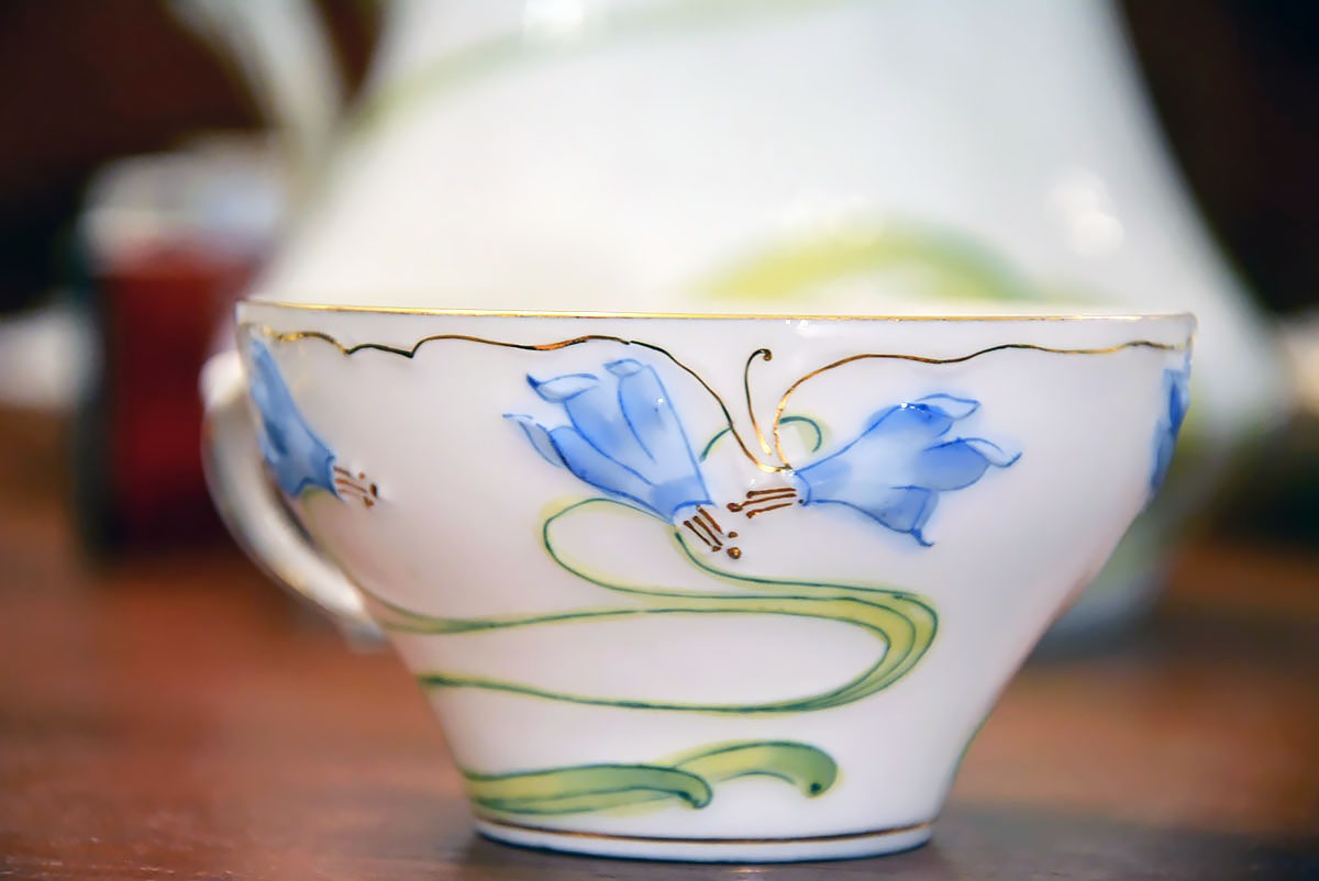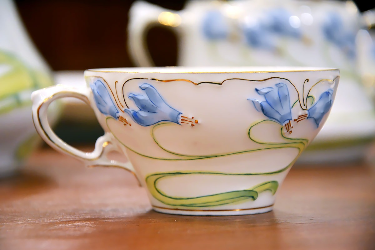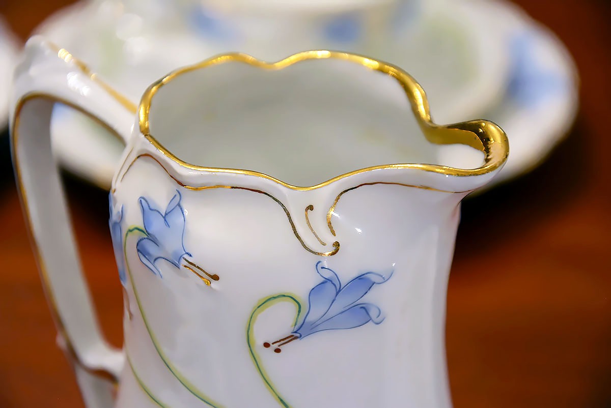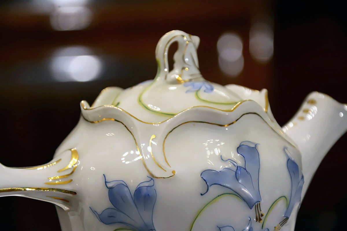 Porcelana utrzymana jest w eleganckim, klasycznym odcieniu czystej bieli, który stanowi idealne tło dla dekoracji i podkreśla lekkość formy. Motyw roślinny stylizowanych dzwonków (campanula) nie jest jedynie malowany – kwiaty zostały dodatkowo delikatnie wyprowadzone w reliefie, co nadaje im przestrzenności i wyjątkowej subtelnej plastyki. W połączeniu z ręcznie nanoszoną kolorystyką w odcieniach błękitu i zieleni oraz finezyjnymi złoceniami, dekor zyskuje głębię i szlachetność, widoczną szczególnie w świetle.